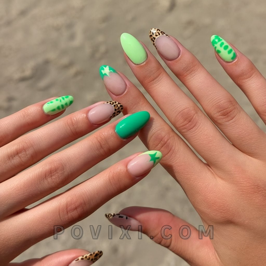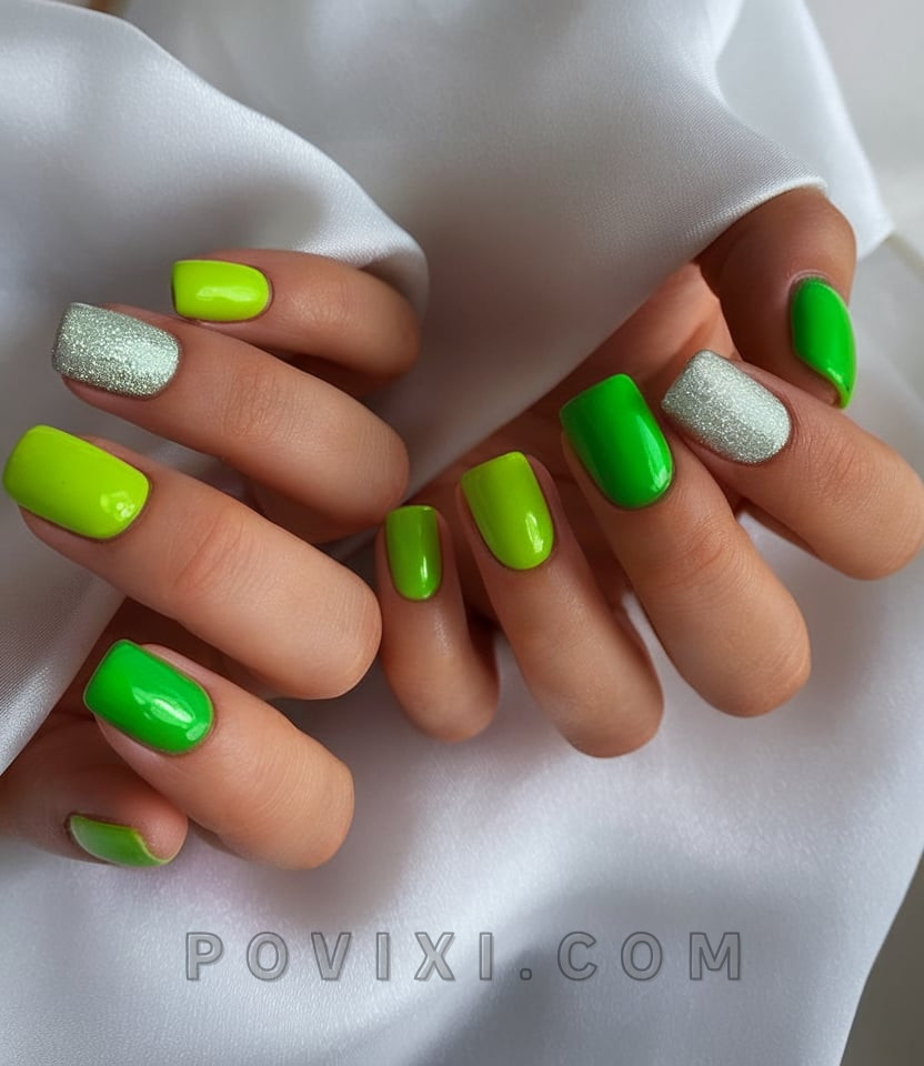 Avoid monochromatic greens by mixing different shades of green in your manicure. Short, square nails combine lime, mint and leafy mid-tones with a neutral shimmer nail that adds sparkle to the ensemble without stealing attention. This manicure works well for festive occasions because of its versatility for everyday wear. The nail design works perfectly with sundresses or professional outfits, making it an elegant solution for everyday use in 2025.