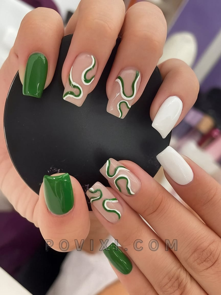 Users should note that this square nail set carries 2025’s affinity for edgy modern abstract art along with powerful, bold green color choices. The manicure is bold yet balanced through its sequence of forest green solid shades and white crisp lines and organic swirling shapes that fill negative space. This manicure design easily transitions from day to night, making it suitable for creative professionals, departmental staff with a rebellious streak, and those who wear white wide trousers with green structured blazers. The manicure epitomizes the modern elegance that should be in your everyday use.