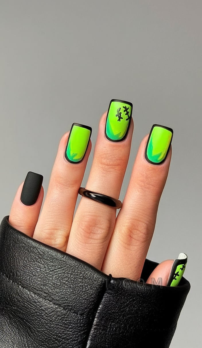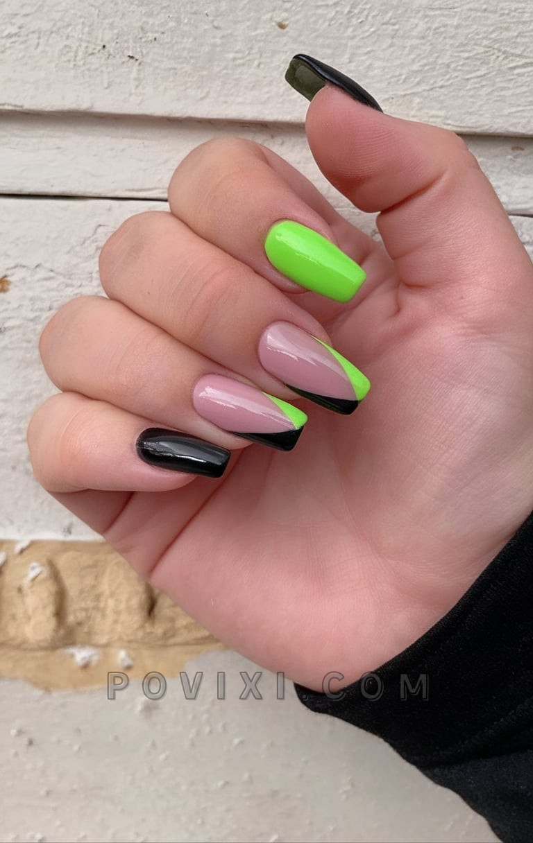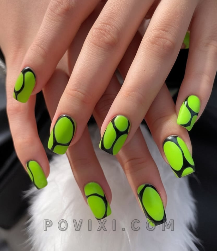 These coffin-shaped nails demand eyeballs rather than whispers, making them dominant among other styles. A bold, fashionable style emerges from this design, which features blocky sections of neon green and nude between jet black. The negative space cut-outs enhance the overall composition while providing a modern architectural aesthetic. For a fashionable look, pair your outfit with a large black t-shirt and lime sneakers while wearing cycling shorts. You are sure to attract attention when you wear these nail designs because they demand immediate attention.