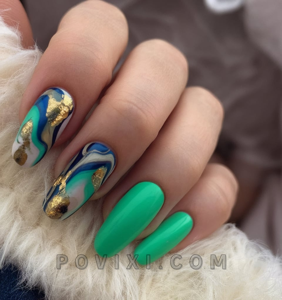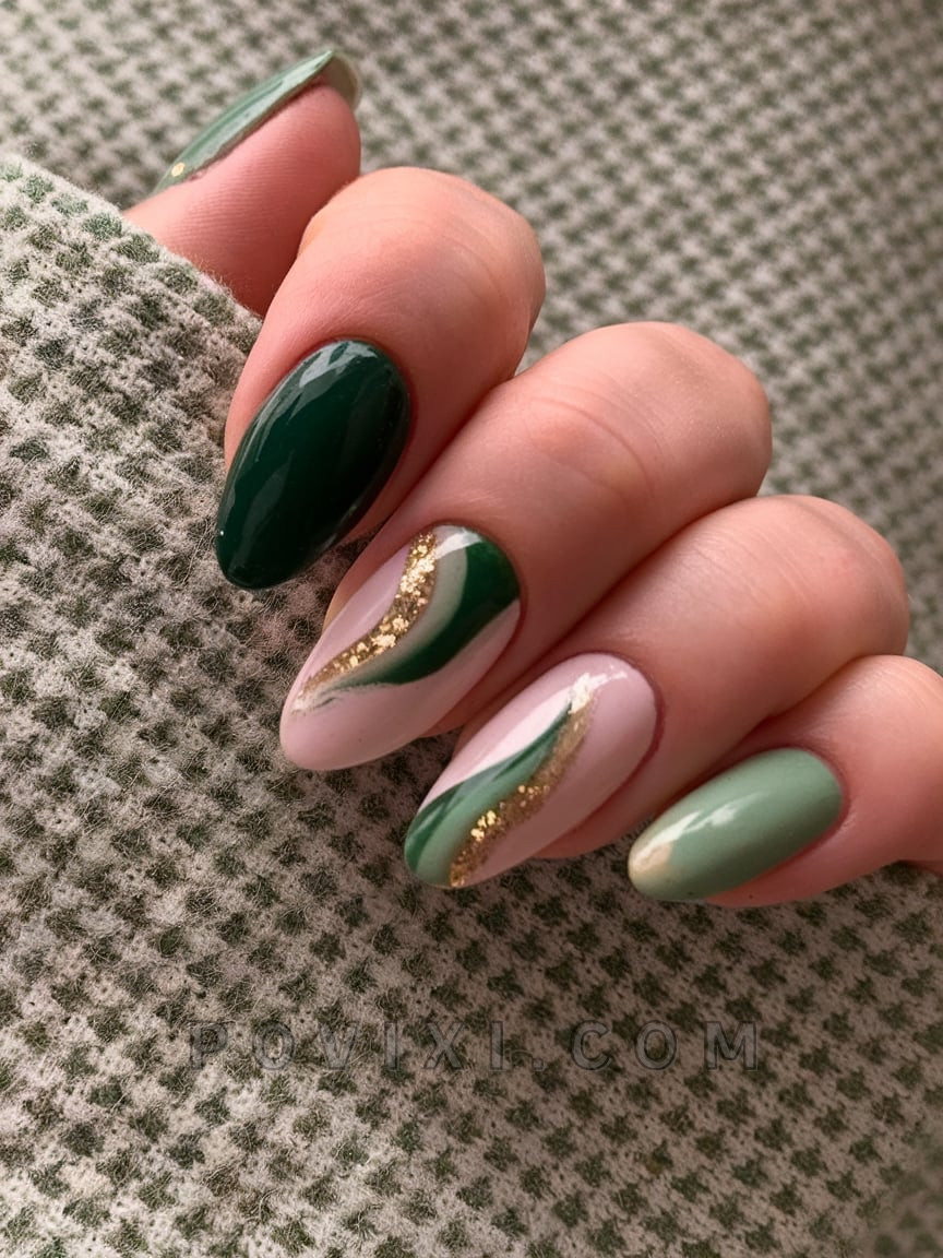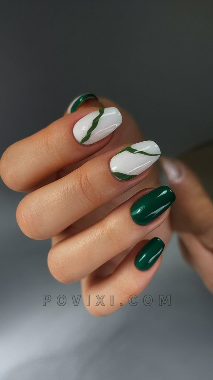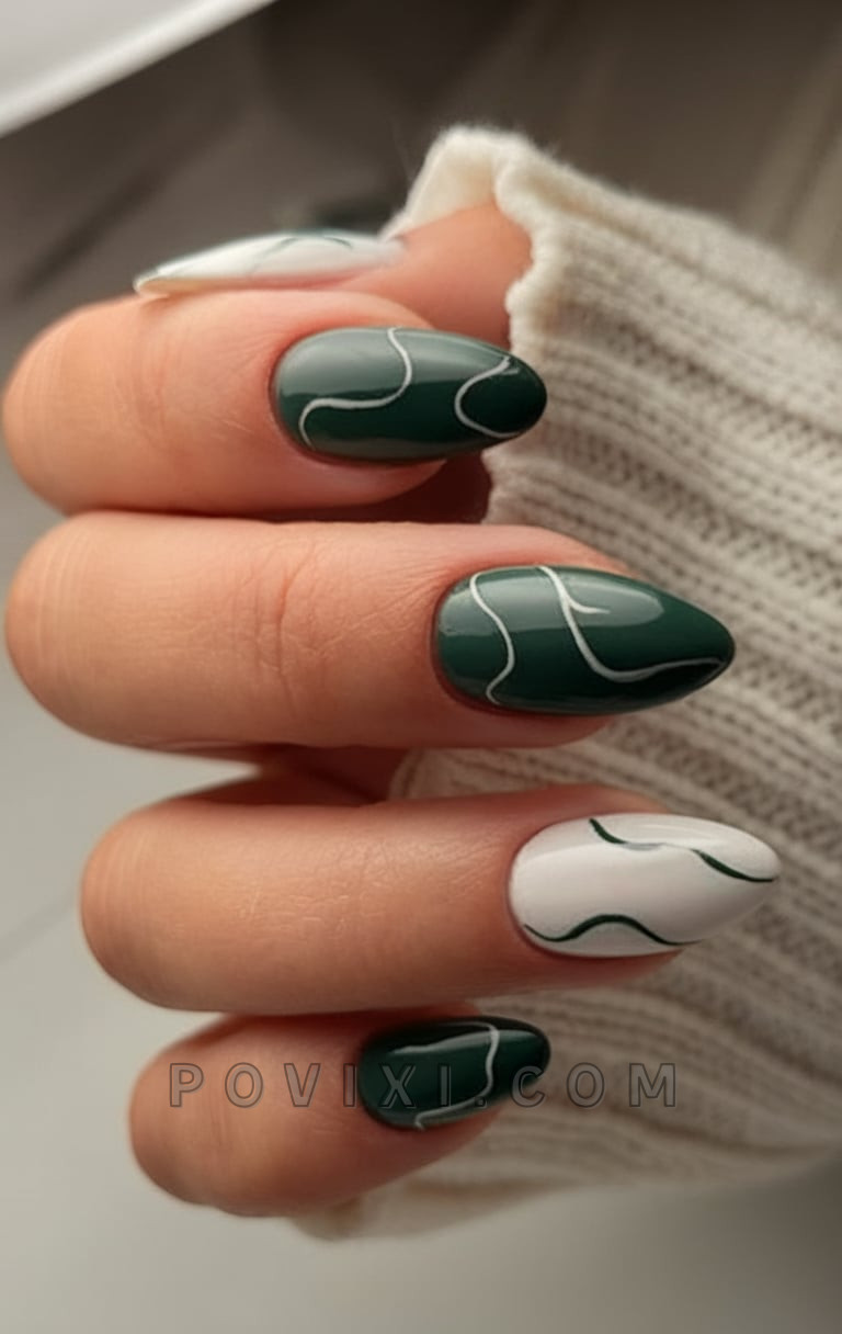 An oval nail set combines deep olive green with creamy white sections divided by intricate green swirl patterns. The style creates a perfect combination of rustic glamour. The nails work well for people who wear monochromatic clothing along with easy flowing linen and cotton outfits. These nails work as an elegant finish for simple outfits that use forest tones combined with silver elements.