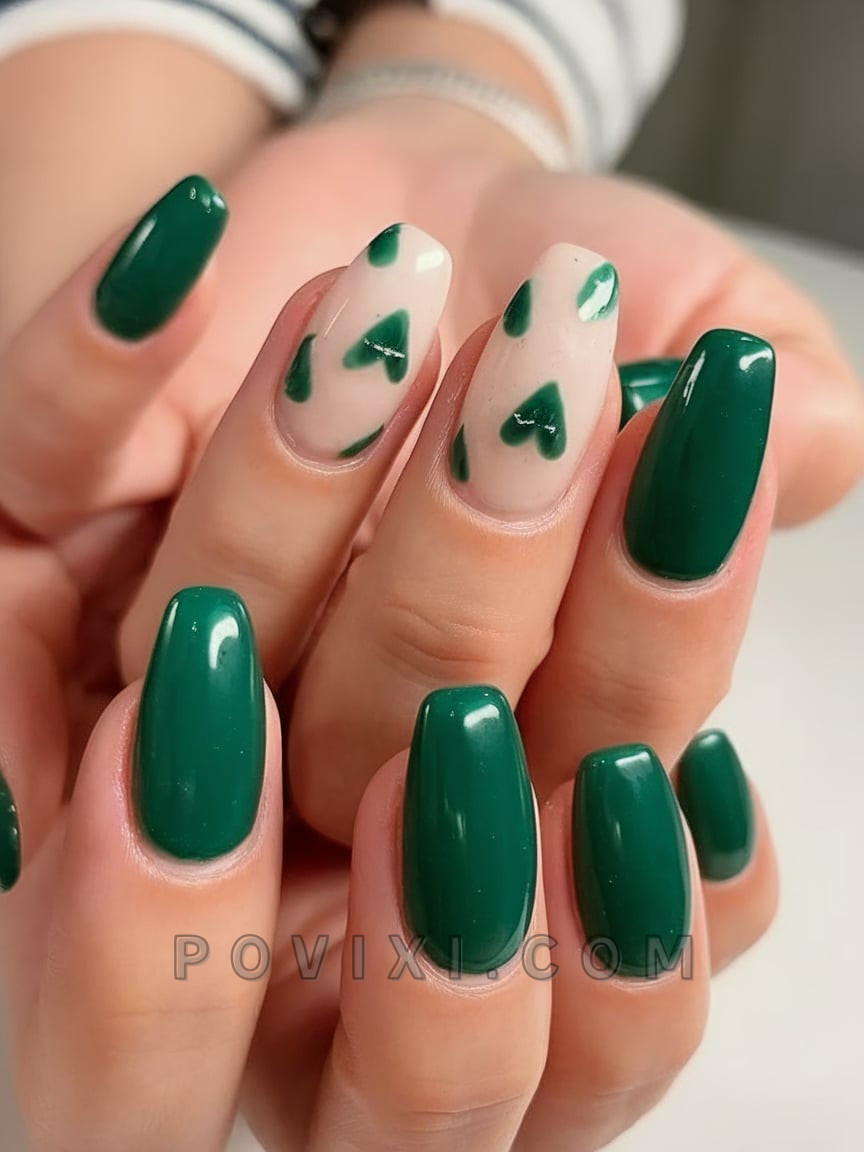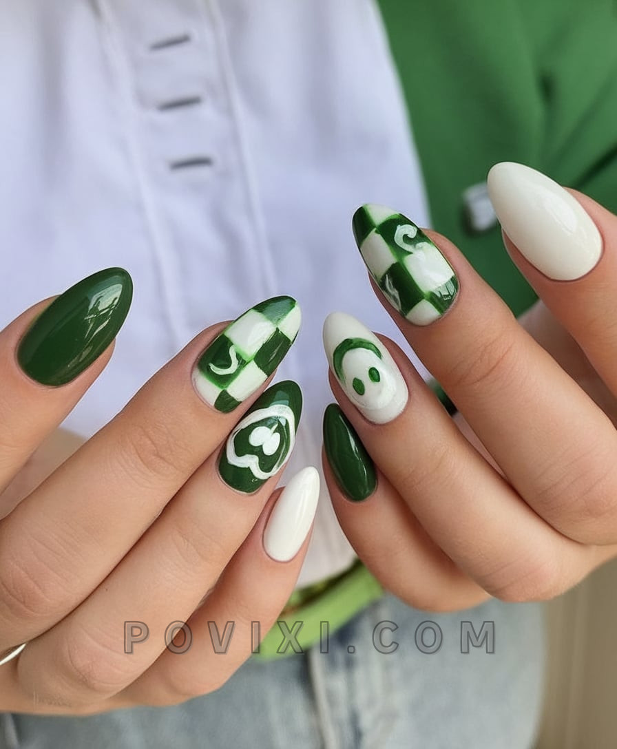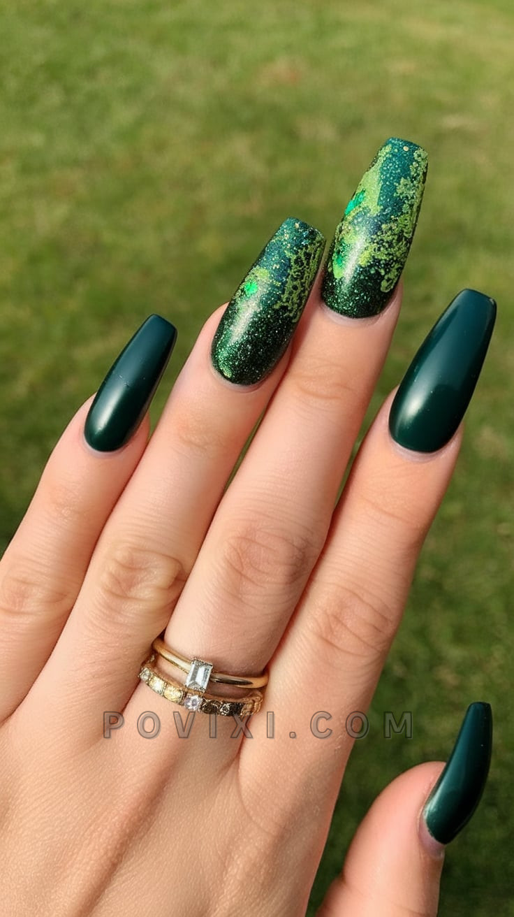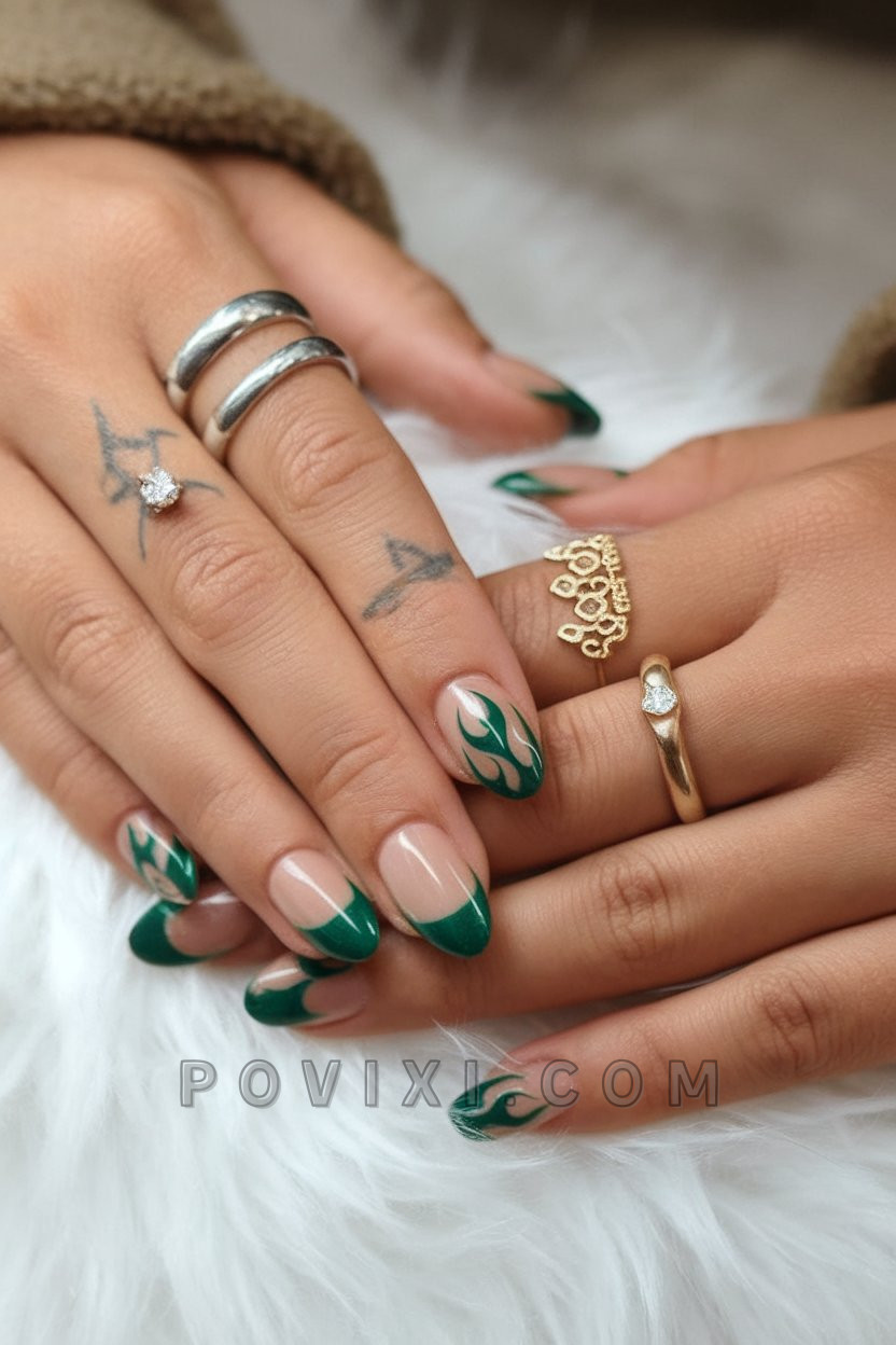 An oval nail set combines deep olive green with creamy white sections divided by intricate green swirl patterns. The style creates a perfect combination of rustic glamour. The nails work well for people who wear monochromatic clothing along with easy flowing linen and cotton outfits. These nails work as an elegant finish for simple outfits that use forest tones combined with silver elements.