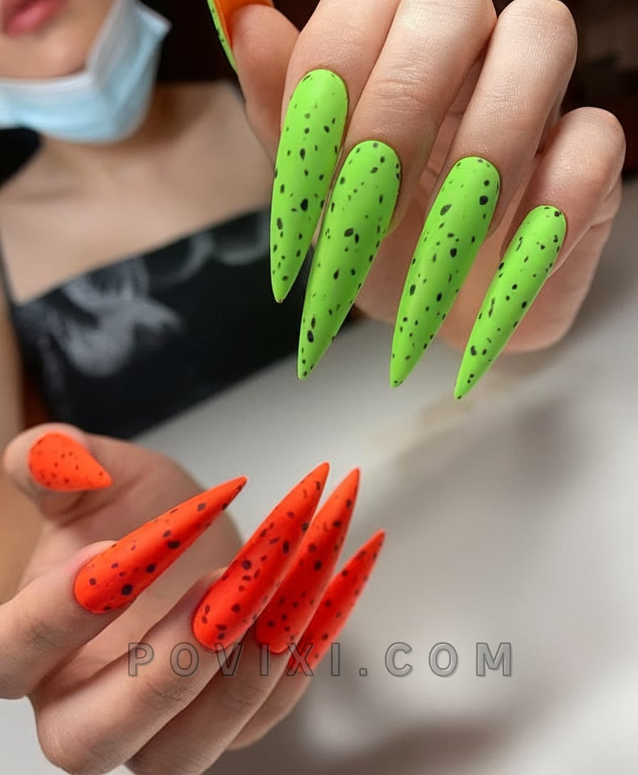 Long stiletto nails with a fun, fruity look capture the playful spirit of the season. The manicure features a neon lime base with a matte finish that features watermelon seeds in black for summer festival energy. These nails are perfect for casual beach and pool events as they add a playful flair to any fashion ensemble. Wear these nails with floaty soft dresses or match them with colorful beachwear with tropical motifs. If you are looking for bold creative ideas with a playful sense of humor, these nails are for you.