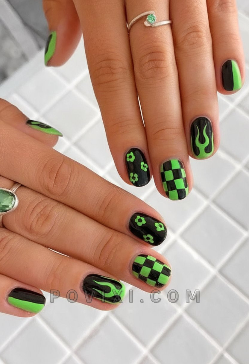 The punk-inspired short round manicure demonstrates pure alt-girl aesthetic beauty. Psychologically, this collection connects with a generation of Internet-savvy individuals by using checkerboard prints, micro flowers and graphic stripes combined with neon green flames as eye-catching designs. The bold imagery is accentuated by the use of a matte black base. The pieces for your summer ensemble include oversized thrifted tees paired with vintage denim and a bucket hat. The cool girl uniform is complete. The designs allow people to express their uniqueness without compromising their true personality.