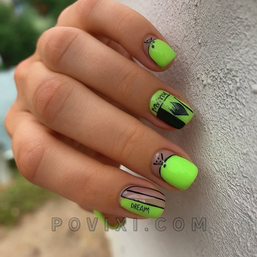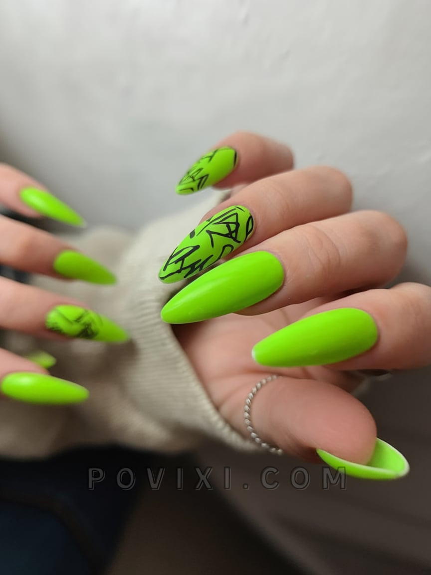 A neon green almond manicure in a bold and edgy style exists for those who desire a daring hand art statement. The intense yellow base creates powerful energy for your outfit then the black graffiti artwork provides a rebellious effect. The graffiti pattern matches the street fashion aesthetic, making it ideal for oversized pieces in your summer wardrobe. Pairing mirrored sunglasses with high-top sneakers creates an urban, attention-grabbing ensemble.