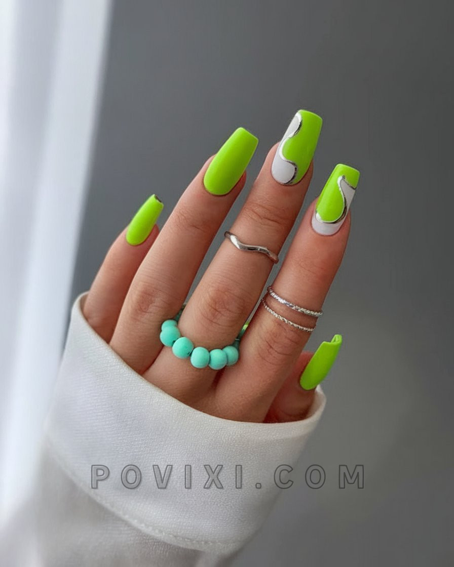A sophisticated square manicure uses matte lime along with silver glitter swirls and translucent elements in its composition. The combination offers a harmonious structure for people who prefer modern, high-fashion styles. Users looking for trendy outfits can pair this style with sharp fashion pieces such as cutout tops and platform sandals with metallic embellishments. The fusion of mint and sophistication in one design becomes a cutting-edge style choice for Summer 2025.