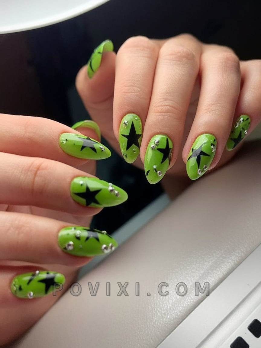The bold nail design established neon summer energy as its main message. Coffin-shaped nails with a lime green base, black starburst designs and chrome studs are the perfect way to attract attention. The reflective surface combined with the rhinestone detailing provides a runway look that is equally at home at a summer party or in a nightclub.