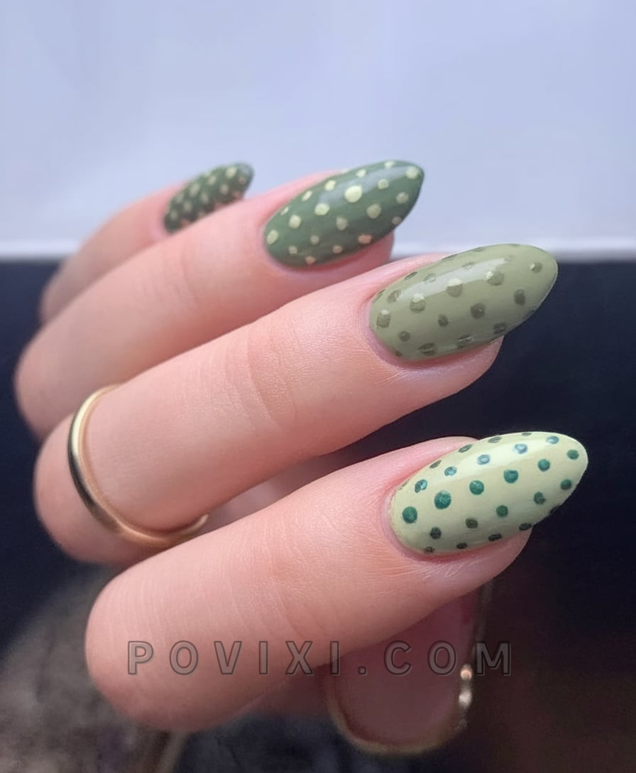 The slender lines of olive and light green nails decorated with charming polka dots combine to create a vintage elegance that easily grabs attention. This retro-luxe look comes from the tidy round shapes and the alternating color pattern. Brazilian women can wear this simple nail design for summer wedding receptions or weekend brunches with linen dresses or flowy tops.