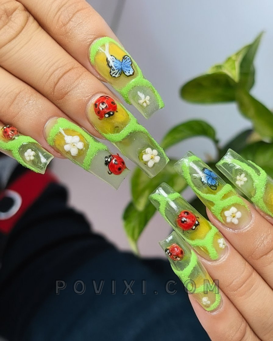 The set pushes nail art innovation with three-dimensional flowers, ladybug figures and blue butterflies arranged on a bright lime green field. The extra length of the coffin nails serves to enhance the garden-oriented motif. The colorful nail design is suitable for summer adventures and individuals who love floral fashion aesthetics, which can be combined with botanical accessories when wearing matching floral outfits.
