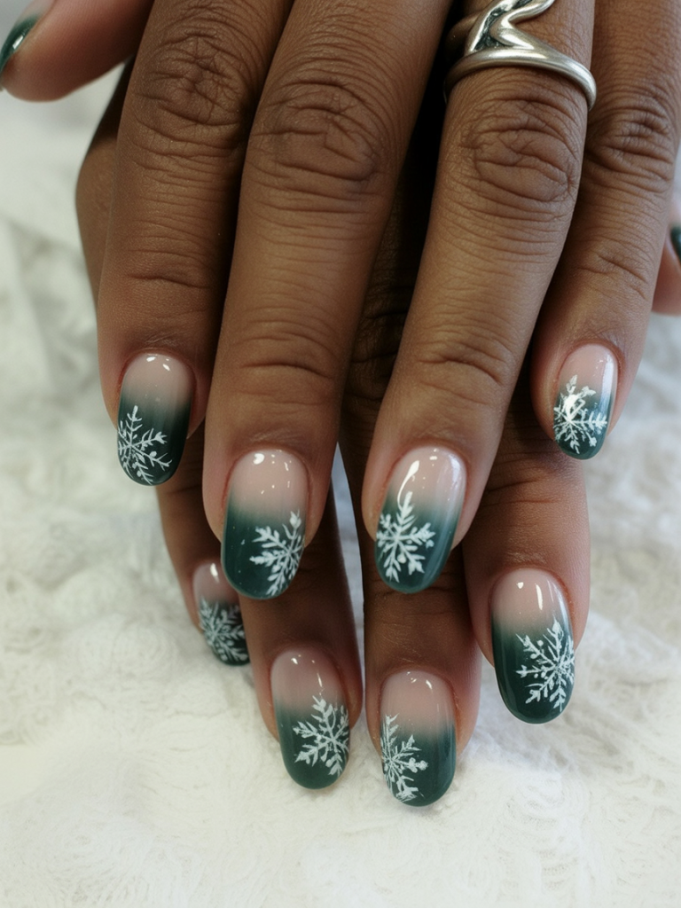 These emerald ombre nails instantly bring winter magic to your fingertips. The deep green shade melts into a soft, natural base, while delicate white snowflake designs sparkle like the first frost on a quiet morning. It’s a look that feels festive yet elegant, perfect for holiday gatherings or cozy evenings by the fire when you still want that touch of glamour.
