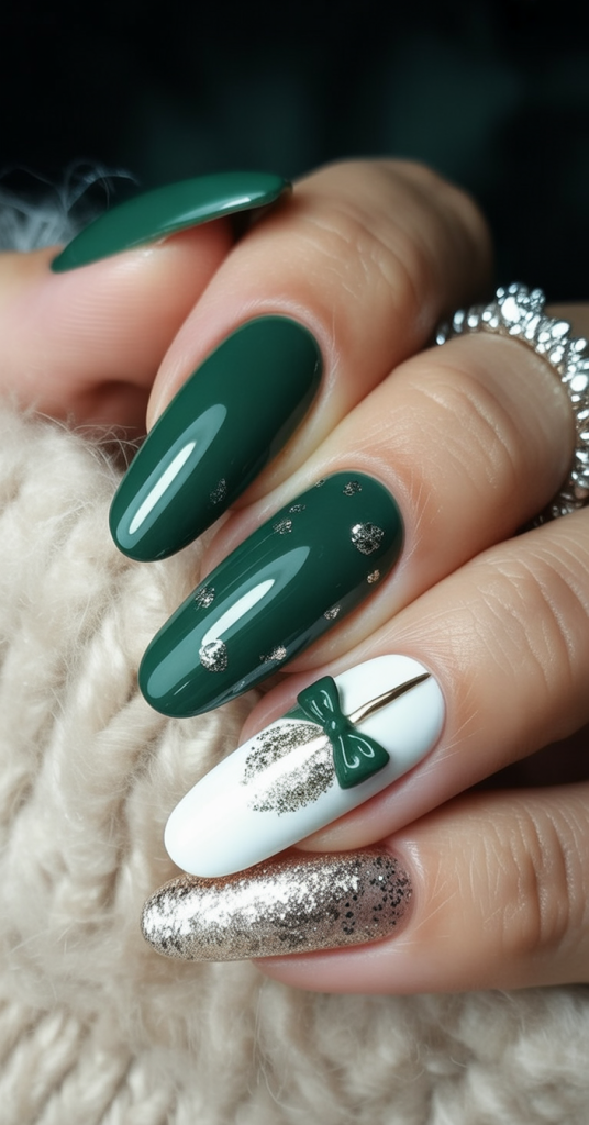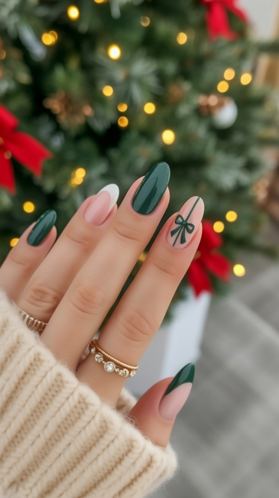 Simple yet full of charm, these nails combine glossy green polish with neutral tones and a single bow design that looks like a tiny holiday gift. It’s minimal but clever, perfect if you like understated designs that still carry a festive touch.
