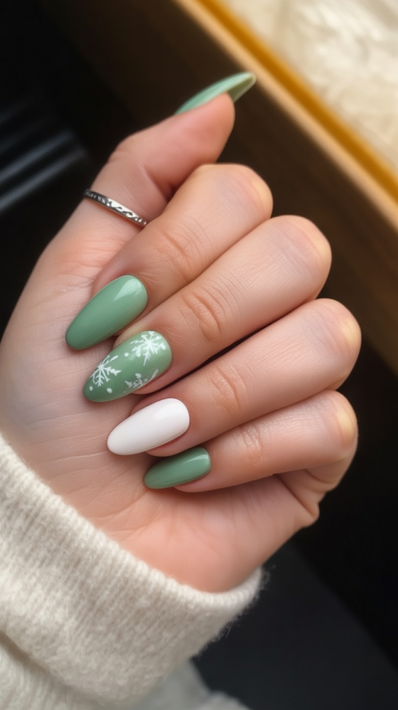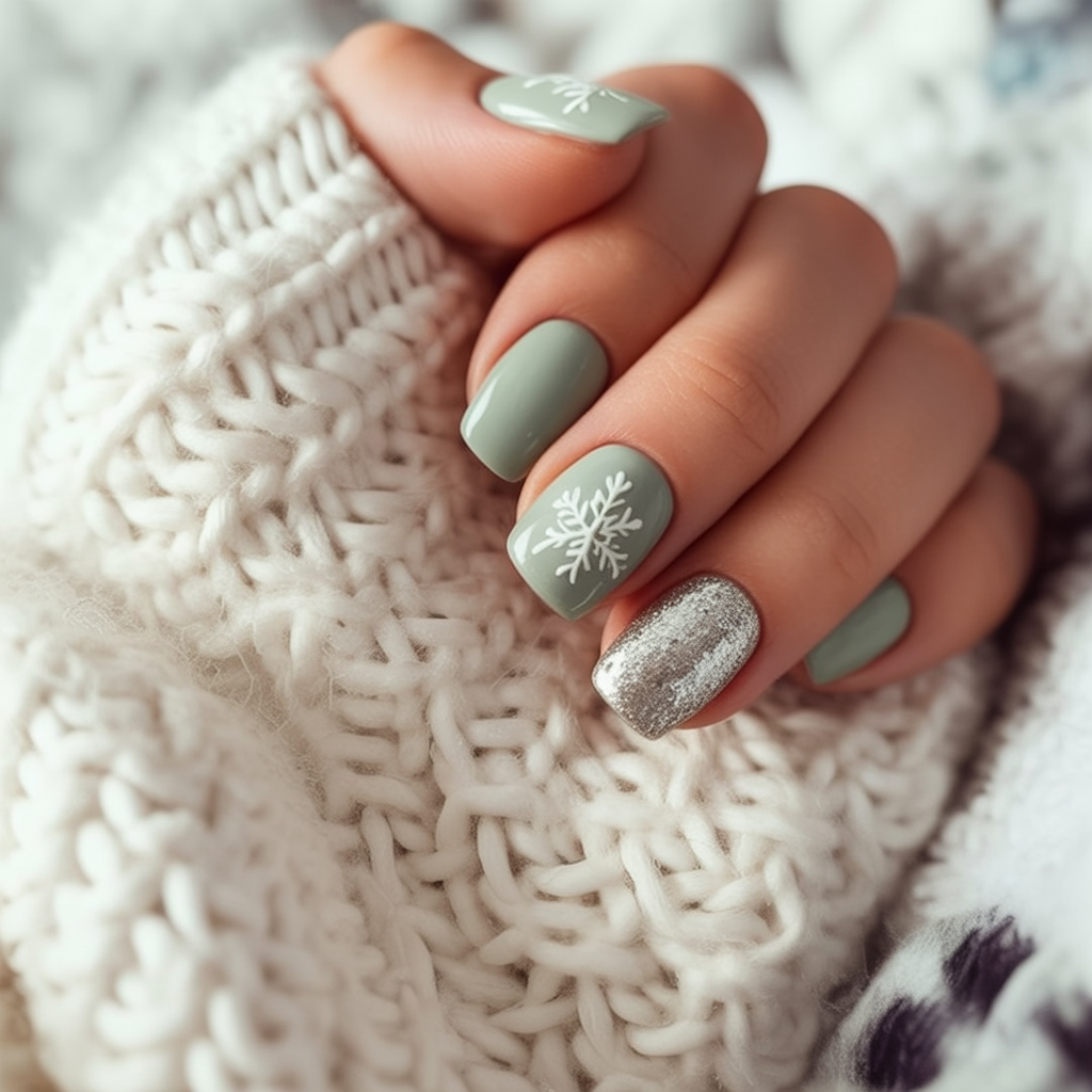Soft sage green makes this manicure feel refreshing and light for winter. Paired with a delicate snowflake design and a shimmering silver accent nail, it strikes a balance between playful and sophisticated. This is the kind of inspo that feels just right for a cozy coffee date or a snowy afternoon stroll.