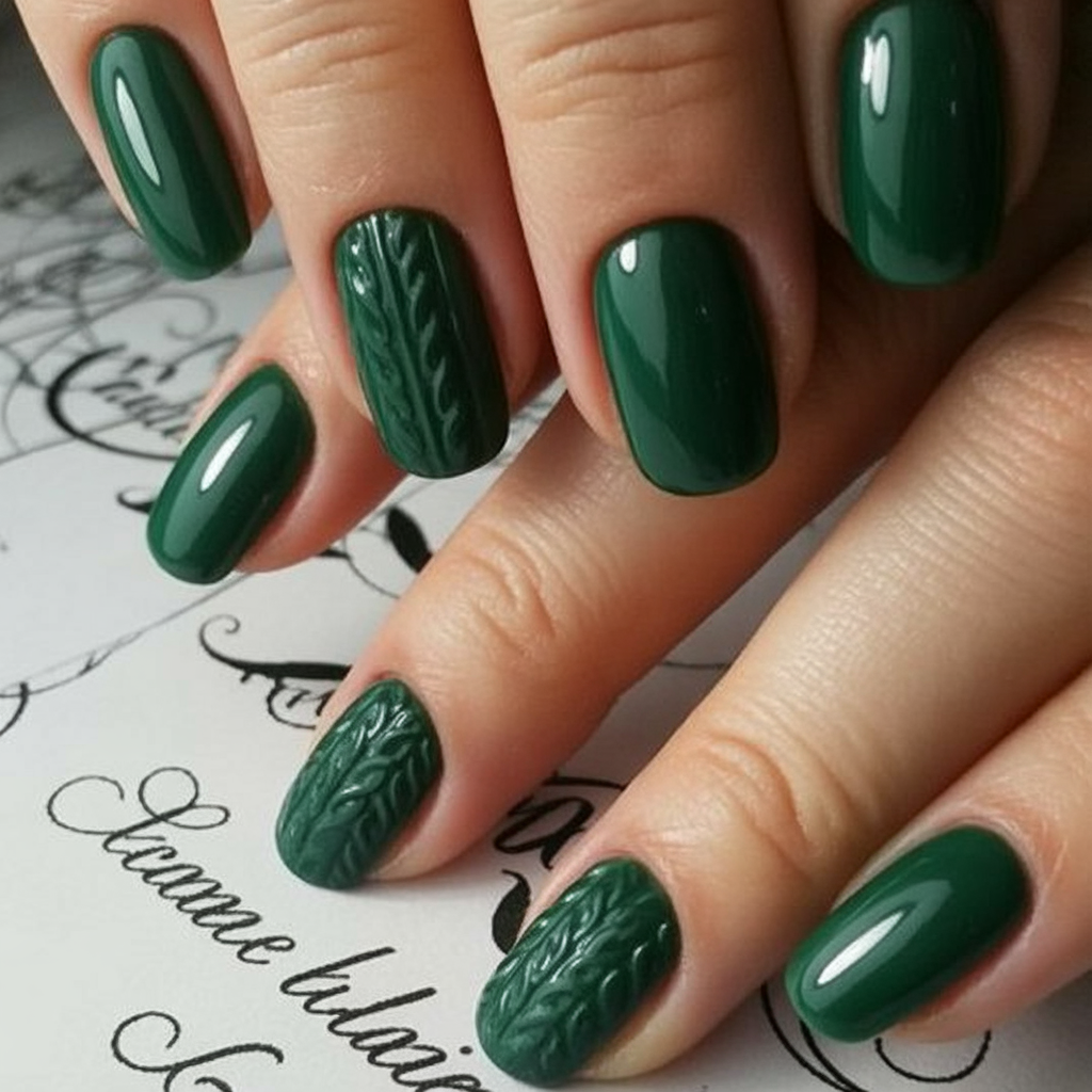 Dark green nails in matte texture are just so cozy when worn with the subtle knit texture on a couple of accent nails. It is as if you are wearing your favorite winter sweater on your fingertips! The glossy finish on the other nails provides contrast to the matte texture to make for a look that is trendy and warm, suitable for cold days.
