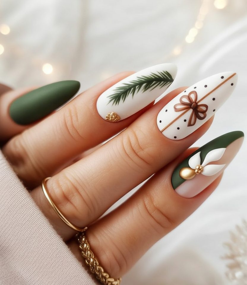 These matte nails feel like little holiday postcards. With pine branch details, gift wrap bows, and floral-inspired art, they’re playful yet elegant. The mix of deep green and crisp white keeps the design fresh and modern, while the golden accents add just the right amount of festive sparkle.