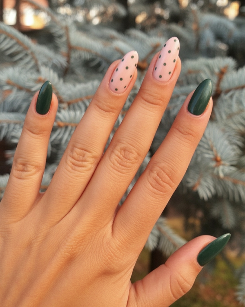 Playful and unexpected, this manicure combines dark green polish with soft pink nails decorated in green polka dots. The contrast is fun and whimsical, bringing a touch of retro charm into a winter palette. It’s a design that feels lighthearted and a little cheeky.