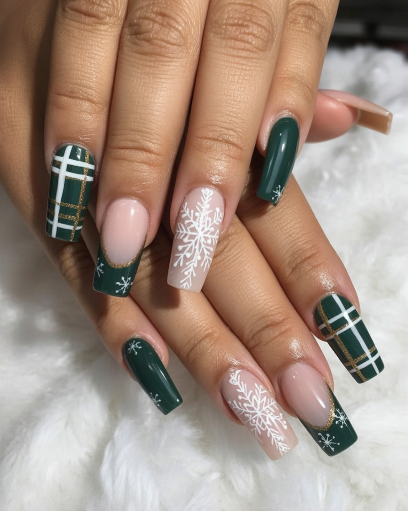 Playful yet refined, this mix of dark green plaid, bold coffin shapes, and delicate snowflake accents feels like holiday fashion bottled up into nail art. The blend of designs—from crisp stripes with hints of gold to intricate white patterns—gives the impression of a carefully wrapped gift. It’s the perfect inspo for women who love their nails to double as conversation starters.