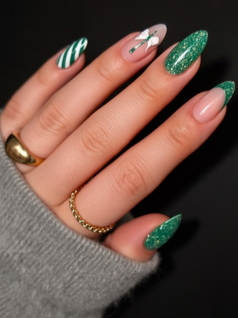 These sparkling green nails mix glitter polish with candy cane stripes and a festive bow accent for the ultimate holiday vibe. The combination of textures makes them eye-catching, while the deep green base ties everything together into a chic seasonal look.