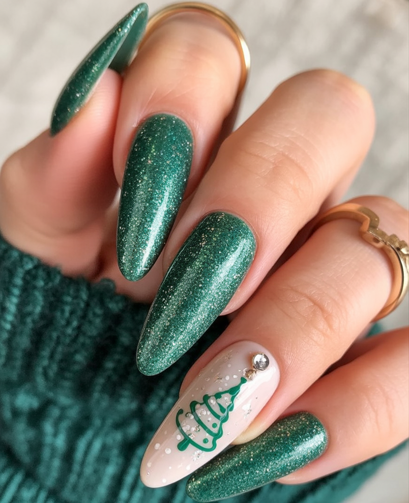 Shimmering green nails meet holiday charm with a delicate Christmas tree design on a single accent nail. The glitter adds a festive sparkle, while the tree art with a rhinestone topper feels whimsical and celebratory. It’s the perfect design for women who want just one statement detail to shine.