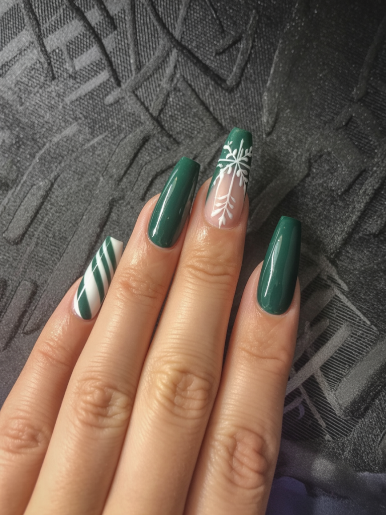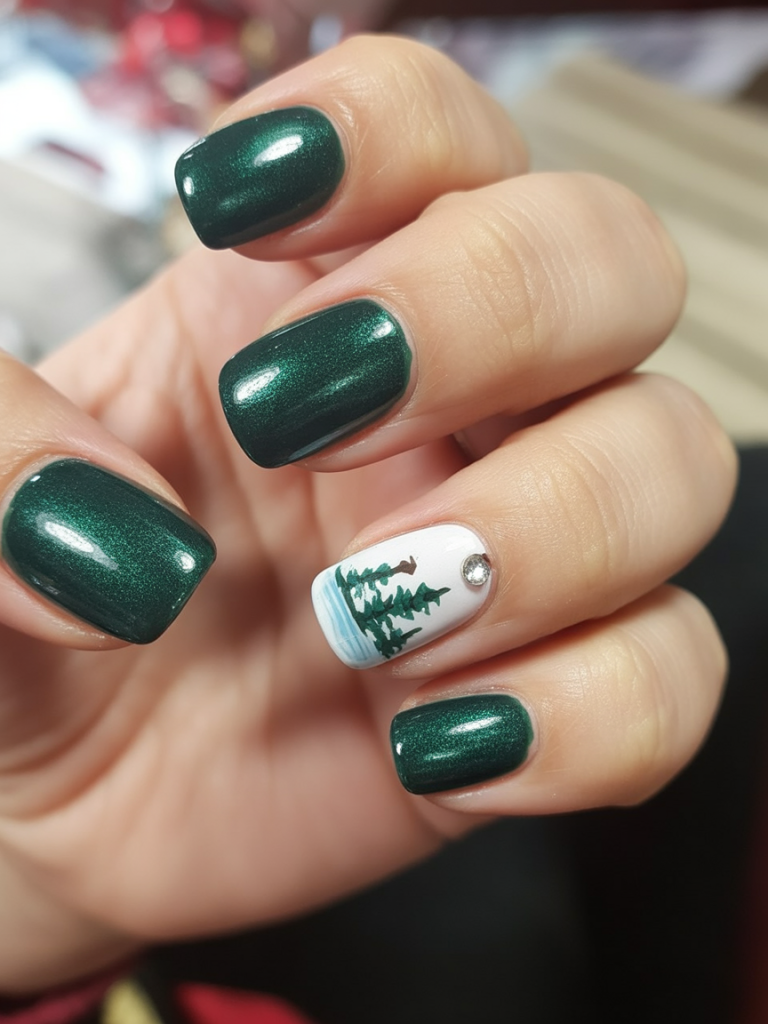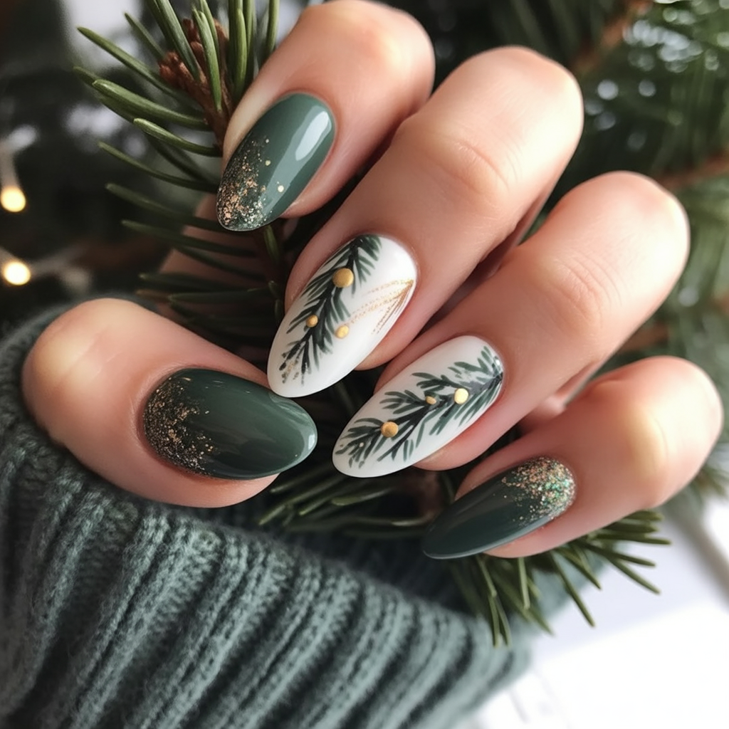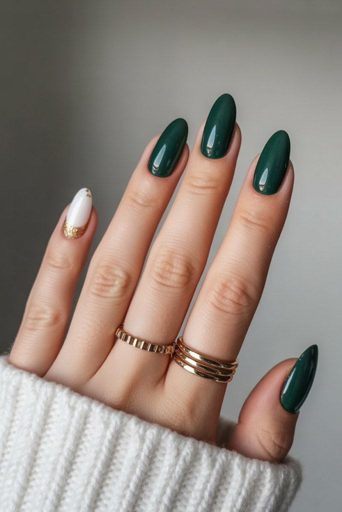 Simple yet striking, this manicure pairs deep forest green nails with a single white accent tipped in shimmering gold. It balances minimalism with holiday sparkle, making it the perfect choice if you want something festive without being too loud.