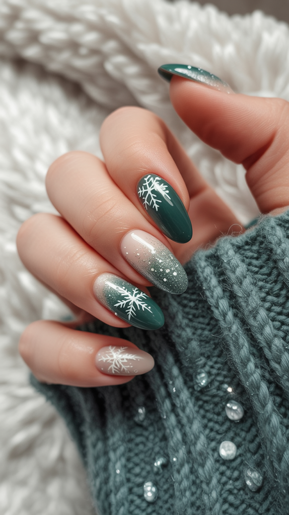 This design is especially flattering on almond shapes, as the elongated silhouette complements the gradient effect beautifully. It works well for women with medium to long nails, and because the snowflakes are hand-painted, each set feels unique. Pair it with a simple nude lipstick or a cozy sage sweater to complete the seasonal vibe.