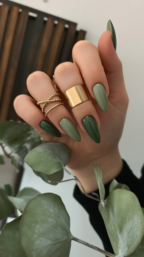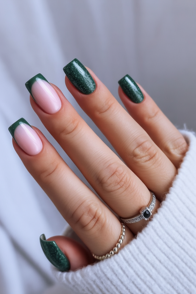 Bold and modern, this two-tone manicure mixes deep emerald with a lighter sage shade, creating contrast that feels chic and fashion-forward. It’s a design that celebrates green in all its wintery tones without needing any extra details.