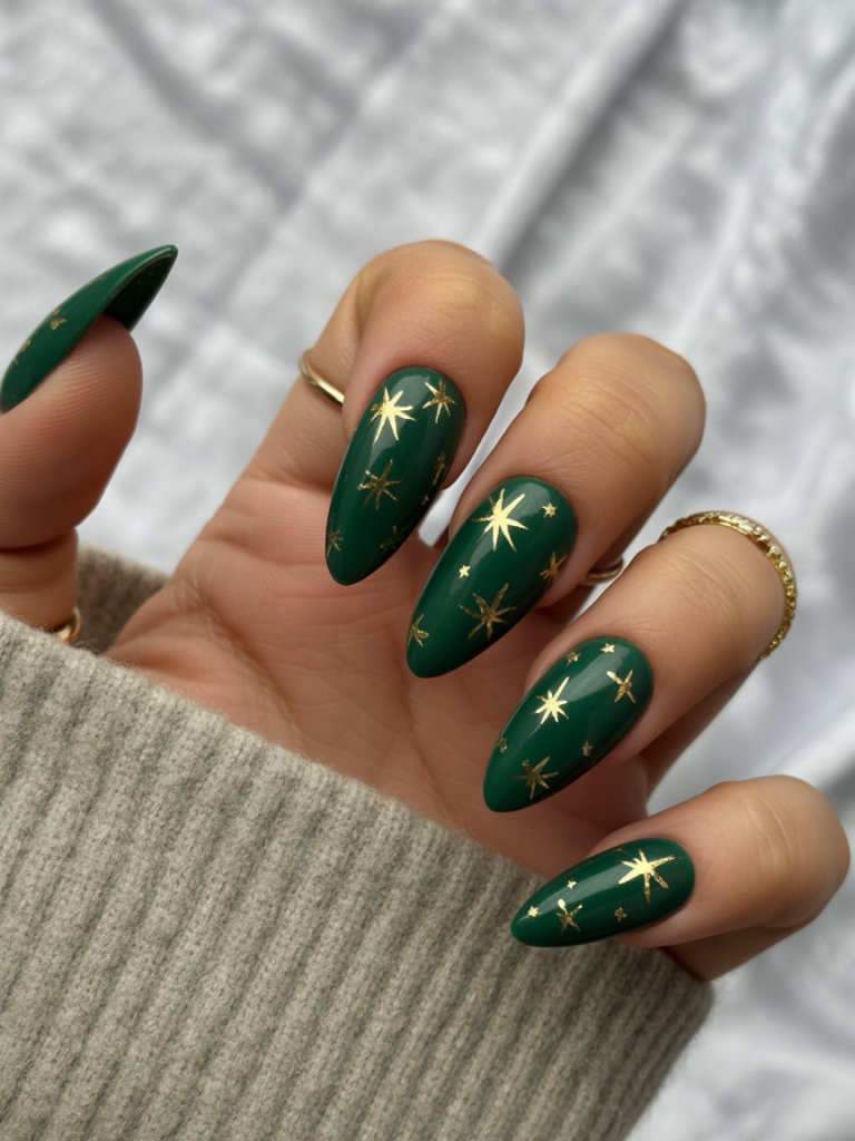 Golden stars twinkle across these emerald nails, creating a magical, night-sky effect. The combination of deep green and metallic gold feels glamorous yet wearable, bringing elegance to your seasonal manicure.