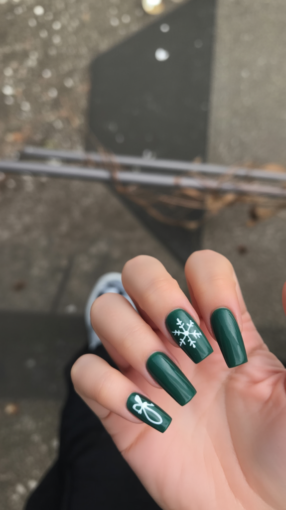 Classic winter vibes come alive with these green square nails decorated with delicate white snowflakes and bow accents. The contrast of bold color and simple white art makes them stand out in a chic, understated way.