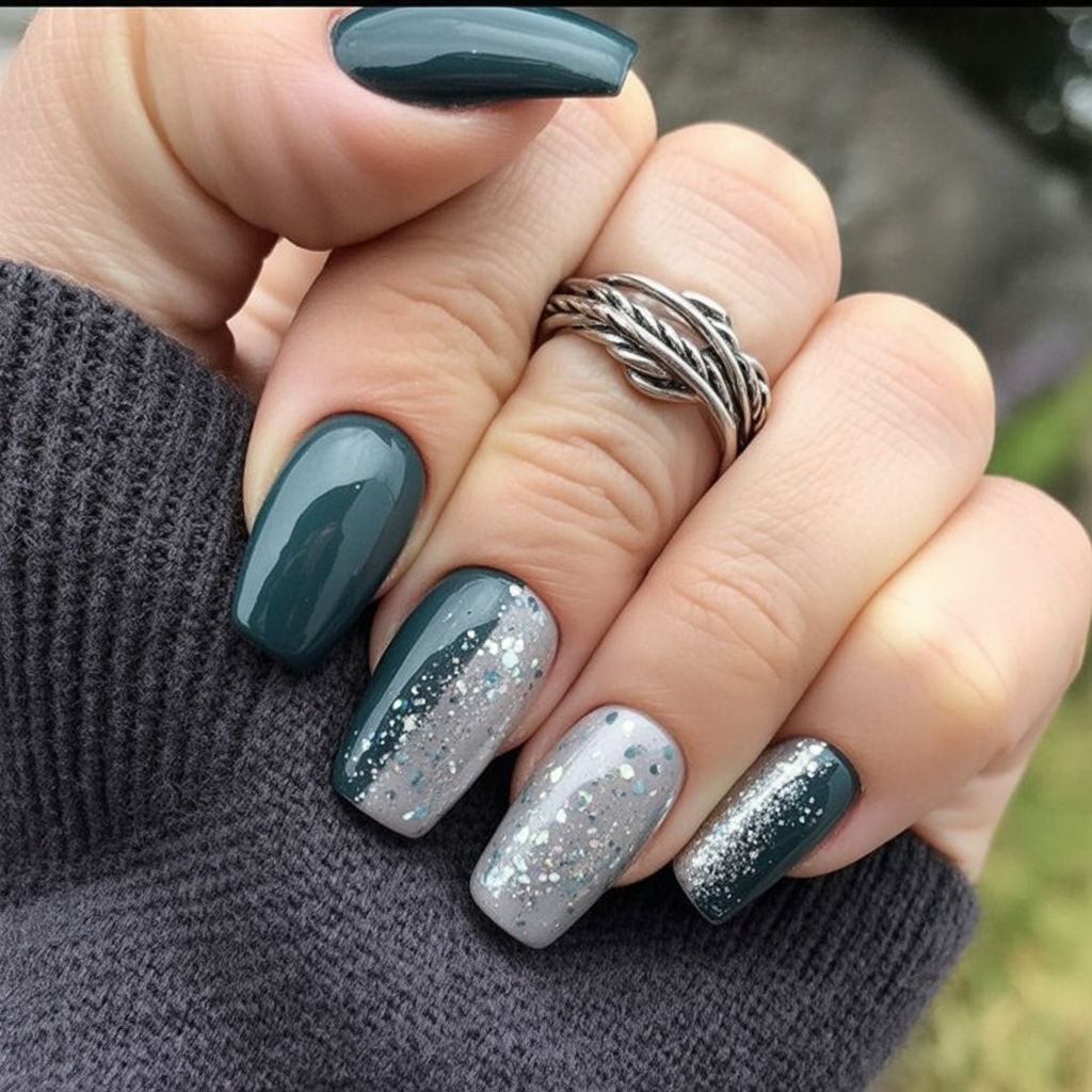 Sometimes the most beautiful designs are the simplest. These square nails in forest green paired with silver glitter accents strike the right balance between subtle and celebratory. The dark tone makes the glitter pop even more, like twinkling lights against a midnight sky. It’s understated enough for everyday wear yet glam enough for winter parties.