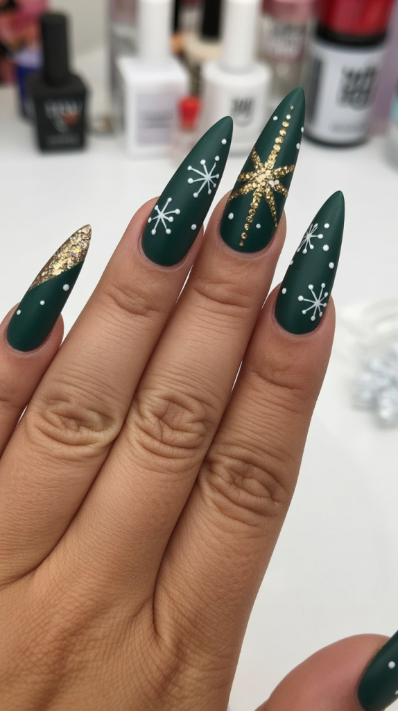 Matte forest green nails get a dramatic upgrade with golden starbursts and delicate snowflake accents. The combination of matte texture and metallic details gives this look a modern, high-fashion feel while still being playful for the season.