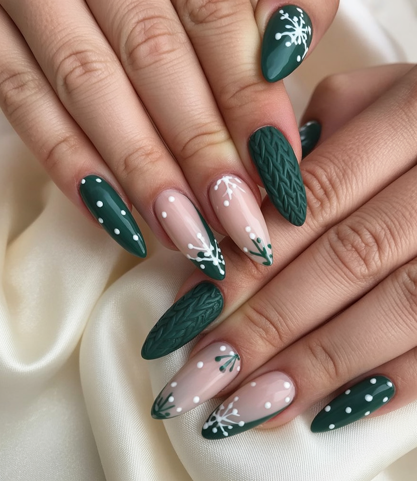 These almond nails blend dark matte green with playful knit textures and delicate snowflake patterns. They feel cozy and creative, like pulling on your favorite winter sweater but with a fashionable twist. The mix of glossy finishes with matte and 3D knit accents makes the design stand out as both stylish and seasonal.