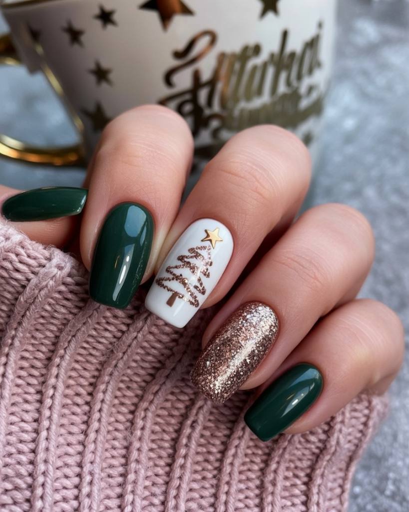 This design feels like Christmas morning wrapped up on your fingertips. Deep green nails are paired with a white accent nail showcasing a sparkly tree topped with a golden star, while a glittery bronze nail adds even more festive shine. It’s cheerful, warm, and instantly puts you in the holiday spirit.