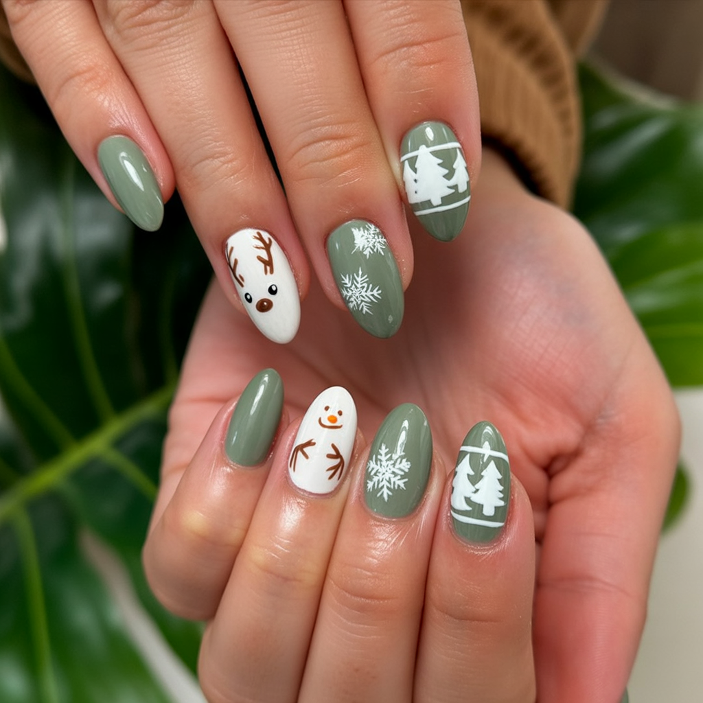 Whimsical and fun, this set brings olive green to life with snowflakes, trees, and adorable holiday characters like a reindeer and snowman. It feels joyful and playful, perfect for anyone who wants their nails to bring a smile to others. The mix of designs keeps it creative and festive.