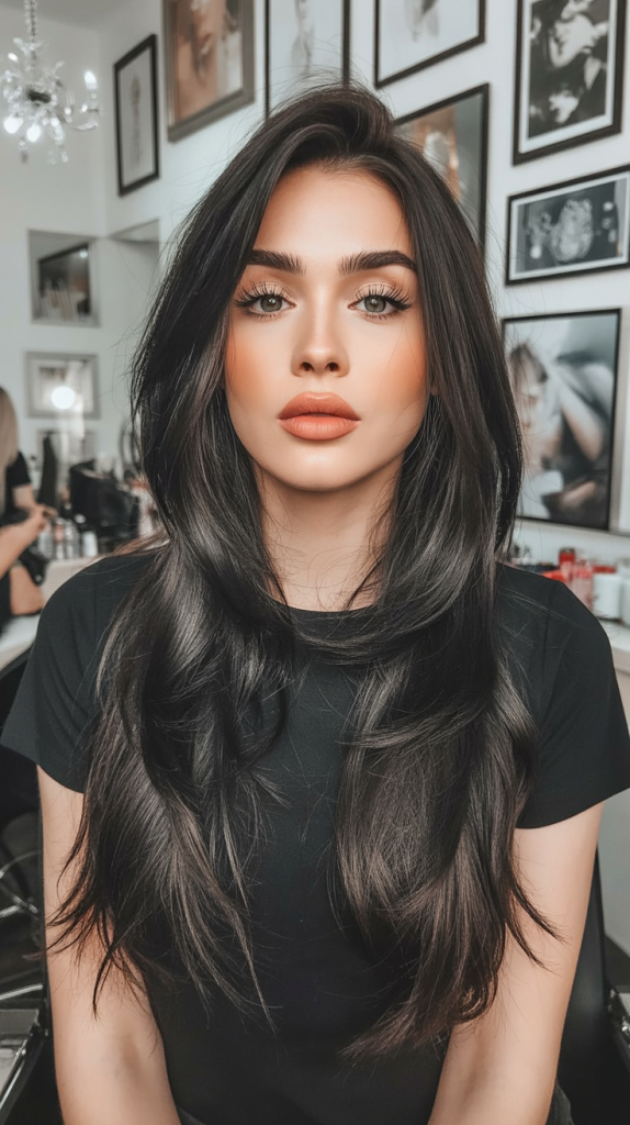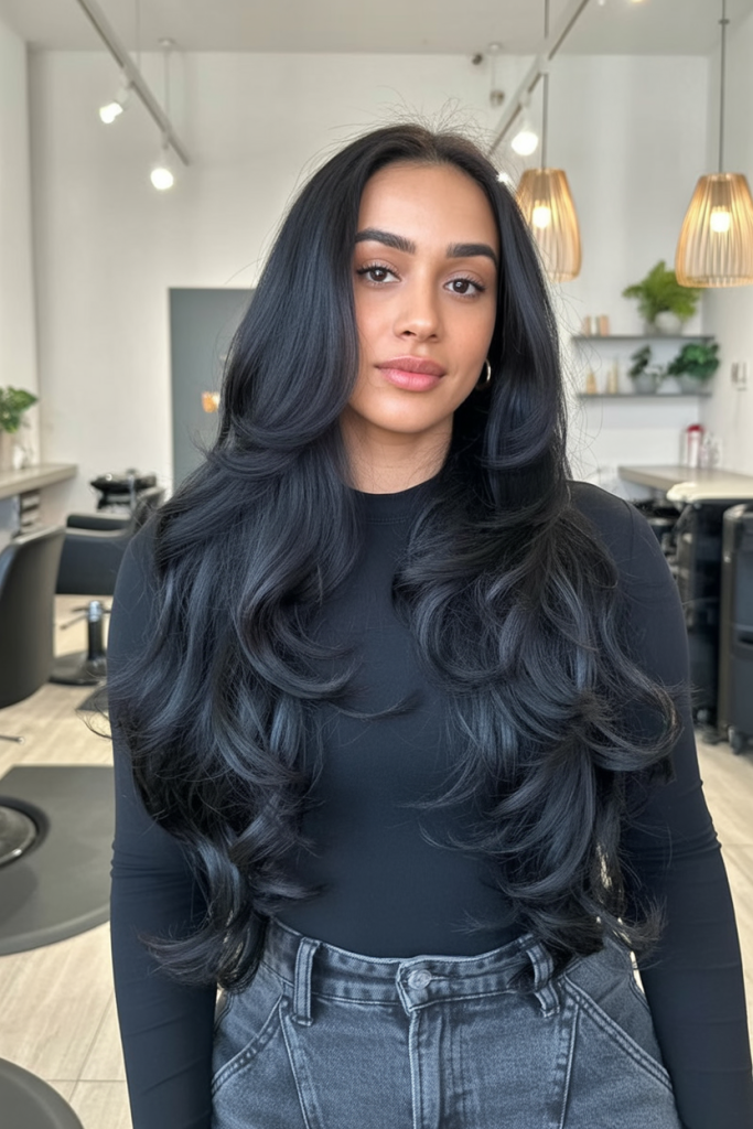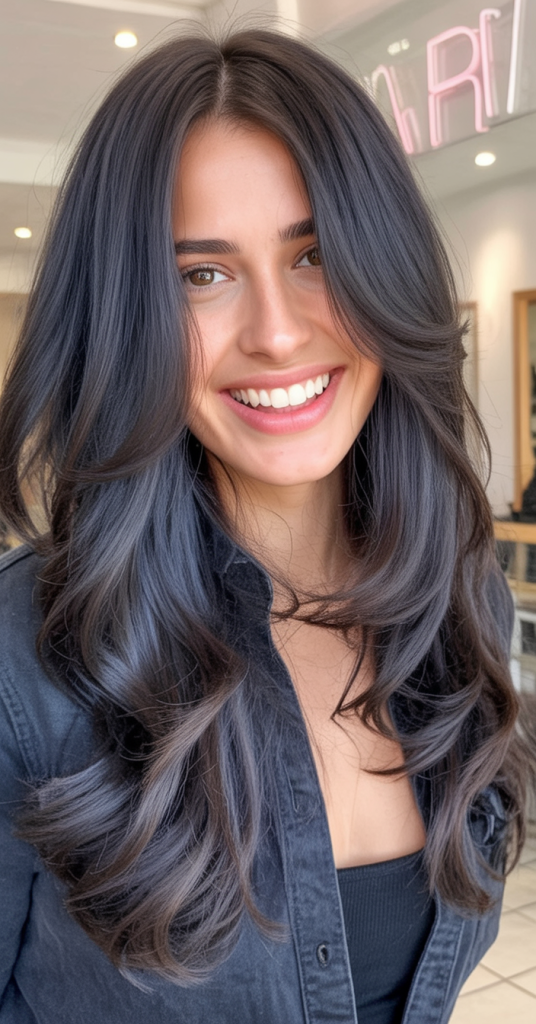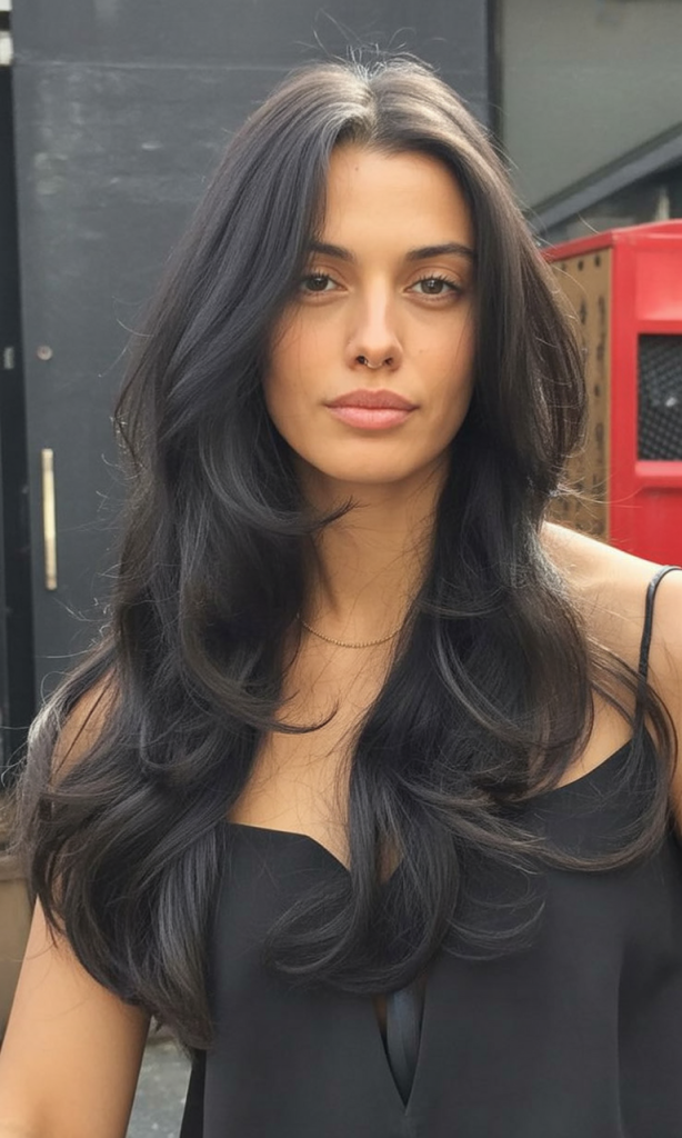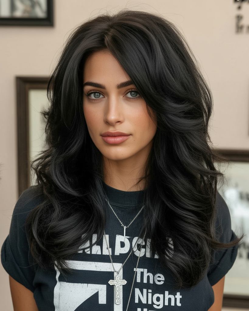 This long layered haircut is bold and striking, with jet-dark strands that command attention. The volume at the crown and the gentle feathering at the ends give it that classic blowout effect—glamorous, confident, and full of personality. It’s the kind of hairstyle that makes you feel like you own every room you walk into.