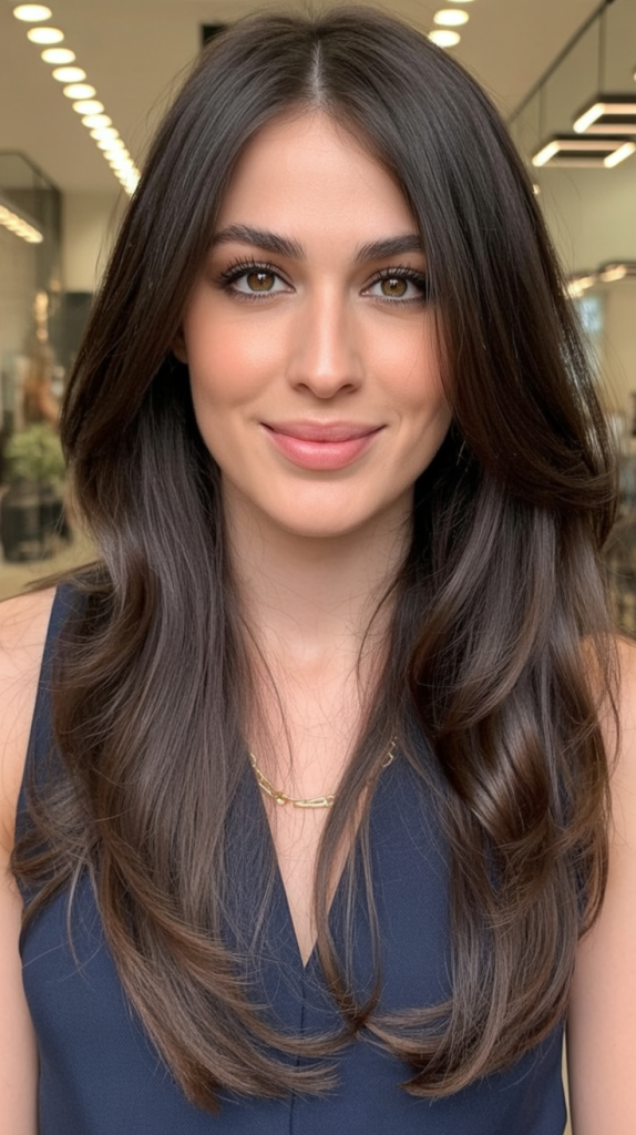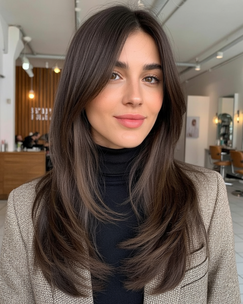 There’s something undeniably chic about the sleekness of long, dark brunette hair paired with soft face-framing layers. The shine alone speaks confidence, while the layers open up the face just enough to feel modern and flattering. This cut carries an understated elegance that feels equally suited for a professional setting or a night out with friends.