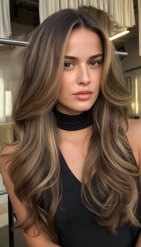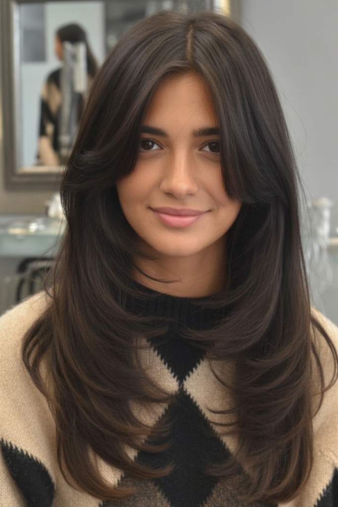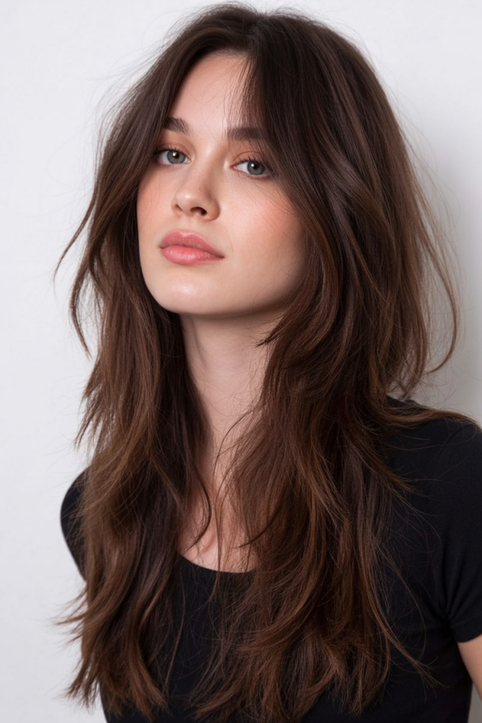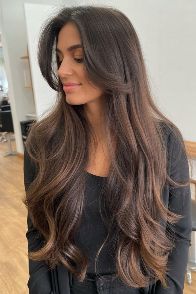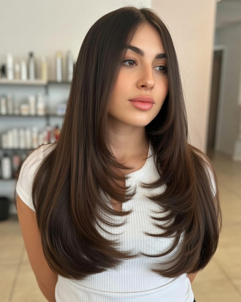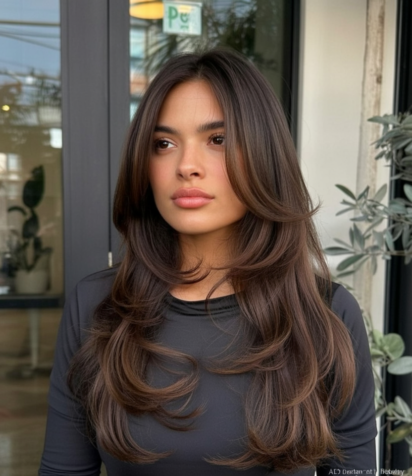 Soft, flowing, and endlessly flattering, this layered cut brings out the richness of chocolate brown hair. The long layers fall naturally, adding shape and movement without looking overly styled. It’s polished but still feels relaxed, making it a versatile choice for any occasion.