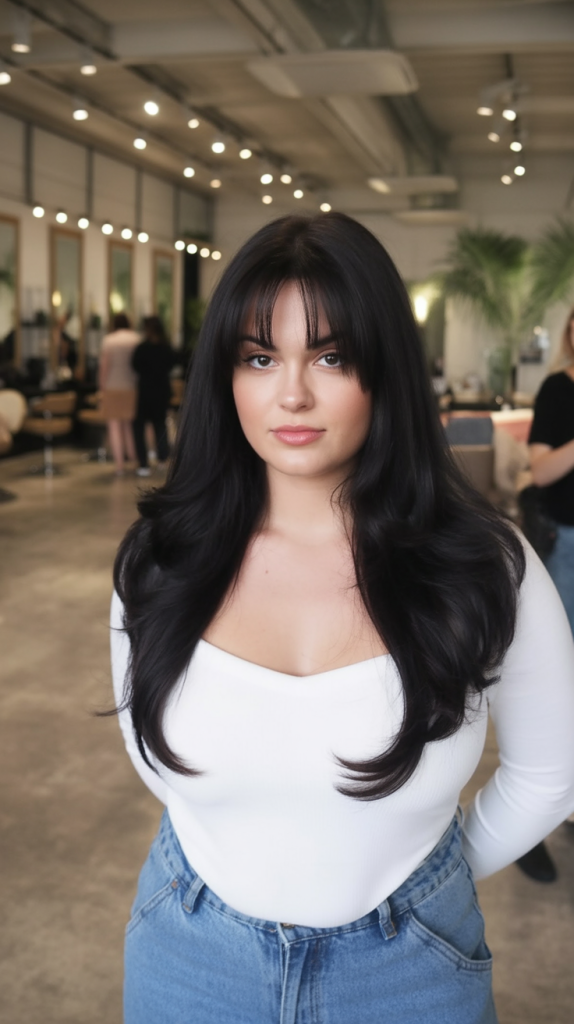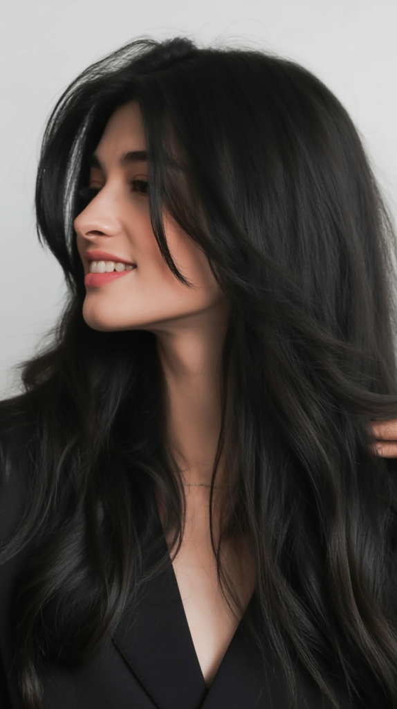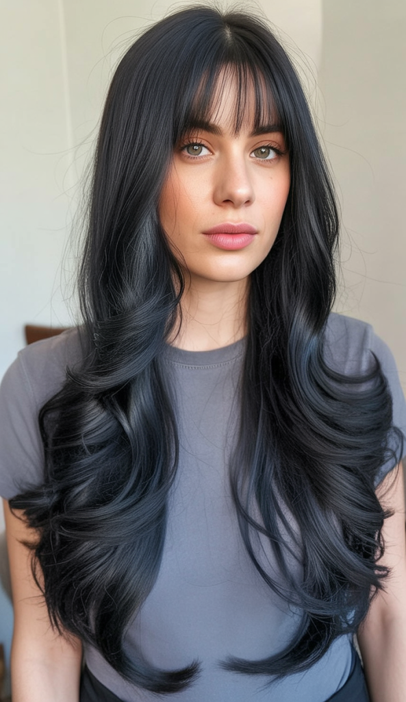 Dark, glossy hair paired with wispy bangs creates a style that feels bold yet approachable. The layers add movement and volume without taking away the drama of the color. It’s a hairstyle that looks striking whether styled sleek or with a bit of wave, perfect for making a memorable impression.