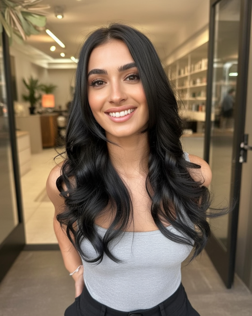 This hairstyle radiates confidence—sleek black hair falling in soft, airy layers that frame the face in a striking yet feminine way. The center part keeps it modern, while the movement in the lengths adds dimension and vitality. It’s one of those cuts that looks equally stunning on a casual day out or dressed up for the evening.