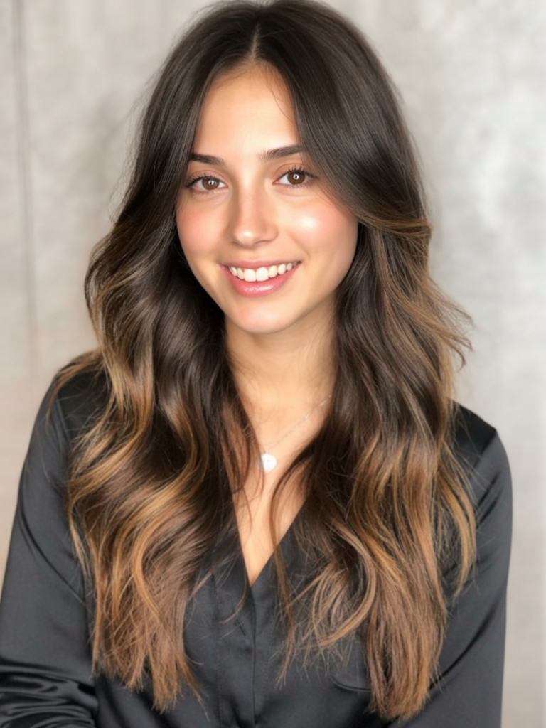 Gentle waves paired with long, layered hair give this style a natural, sun-kissed charm. The lighter tones woven through the dark base add dimension, creating the kind of effortless beauty that feels fresh year-round. It’s soft, approachable, and easy to wear with any outfit or mood.