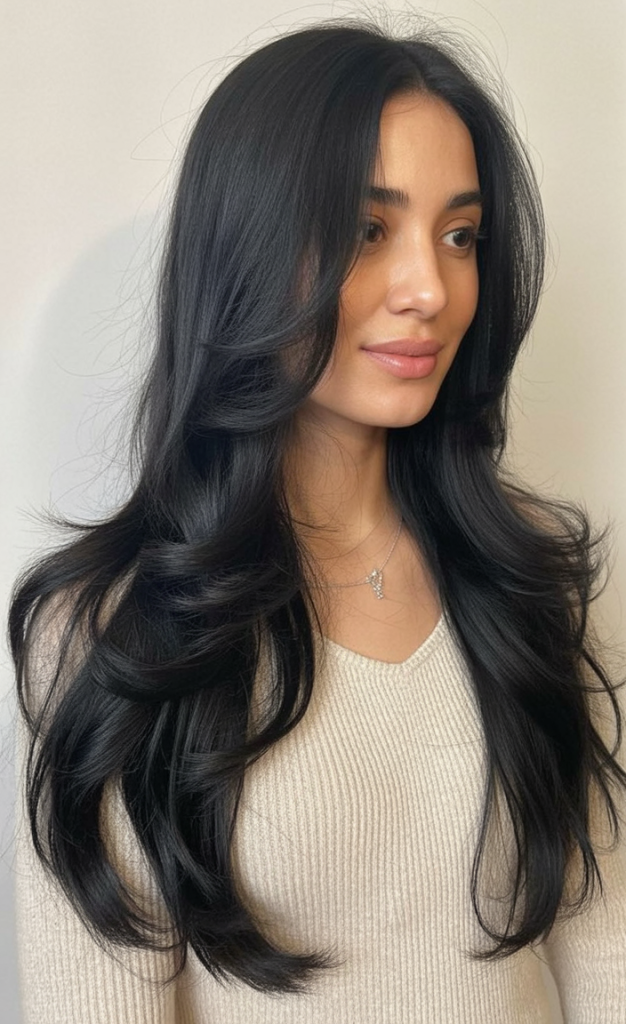 Few things make as strong a statement as glossy jet-black hair styled in cascading layers. It feels bold, confident, and completely timeless. The layers bring softness to what could otherwise feel heavy, keeping the look balanced and approachable.