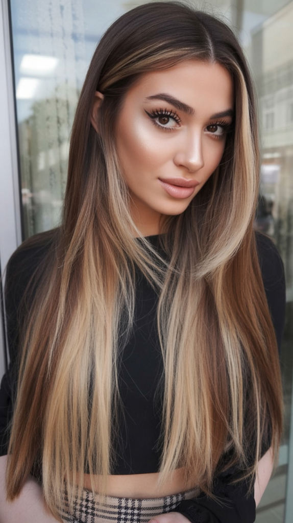 This hairstyle is sleek, modern, and edgy—long layers paired with bold, high-contrast highlights that frame the face beautifully. The sharp lines of the straight layers balance the softness of the lighter streaks, creating a contemporary yet wearable look.