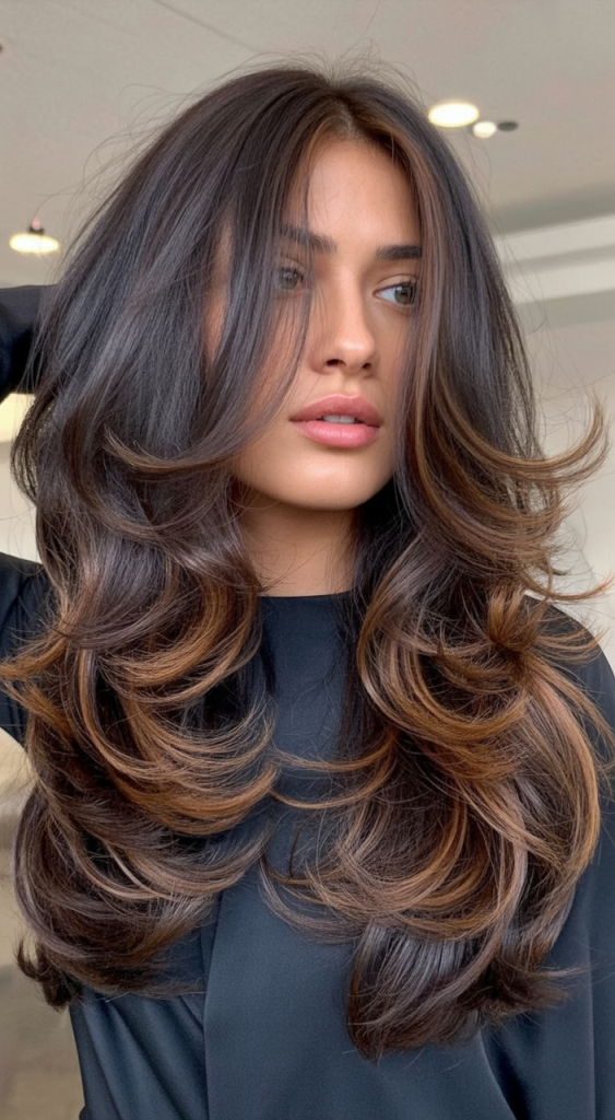 It is a lively and dynamic hairstyle, with layered long dark hair and caramel highlights that feel warm and inviting. The layers add movement and energy to the style, and the lighter shades of the highlights reflect the sunlight, highlighting the sophisticated and warm aesthetics. It is a beautiful style for someone looking for a natural yet polished hairstyle.