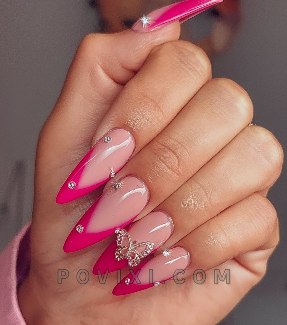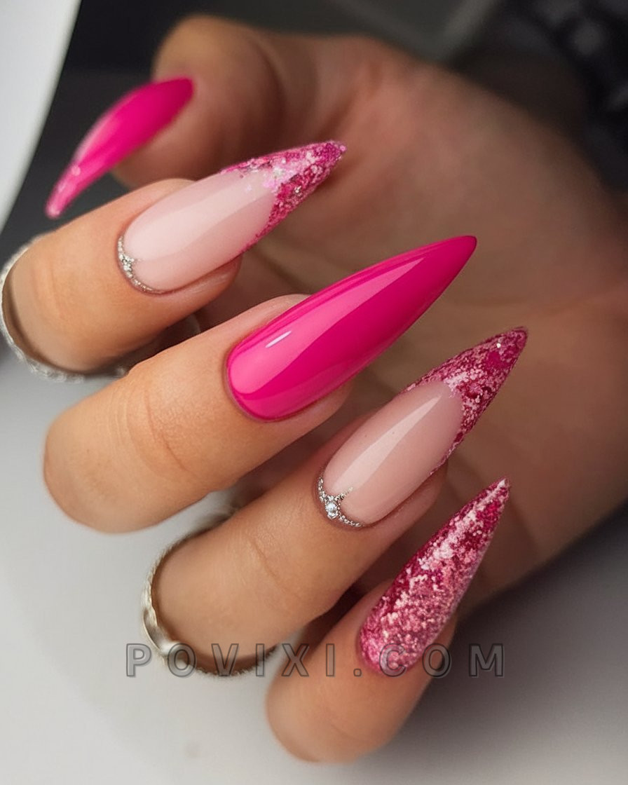 This acrylic stiletto nail design is a perfect fusion of hot hues along with a bold pink look that showcases an unapologetic pink aesthetic. A nude base holds together a full fuchsia shine with glitter filled ombre tips and silver rhinestones placed close to the cuticle. This design creates an optimal mirror reflection of summer sunlight through its high gloss appearance. This design suits women who want a glamorous touch after events, but prefer a minimalist look on regular gel and dip nails. Wearing silver statement rings with this look adds sparkle.
