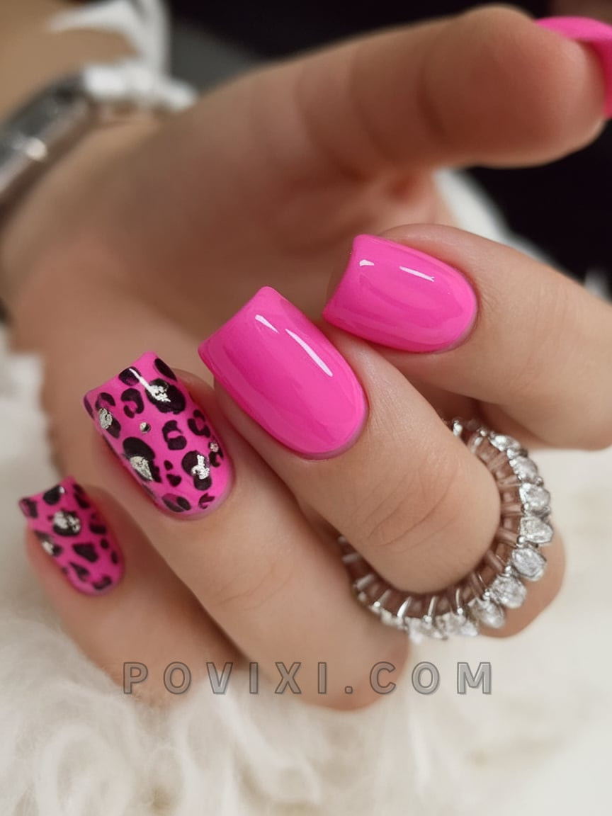 This short square polish combines a bold concept with a fearless attitude through its flashy and daring appearance. Hot pink gloss serves as an eye-catching base for these nails, while dark leopard hand-painted dots get their shine from silver details outlining black prints. Combined with rhinestone studs, these nails create a textured and shimmering summer night accessory. Designed for nightclubs and festivals, the striking cellular gel nails capture the essence of contemporary fashion with their appeal to crop tops and denim shorts.