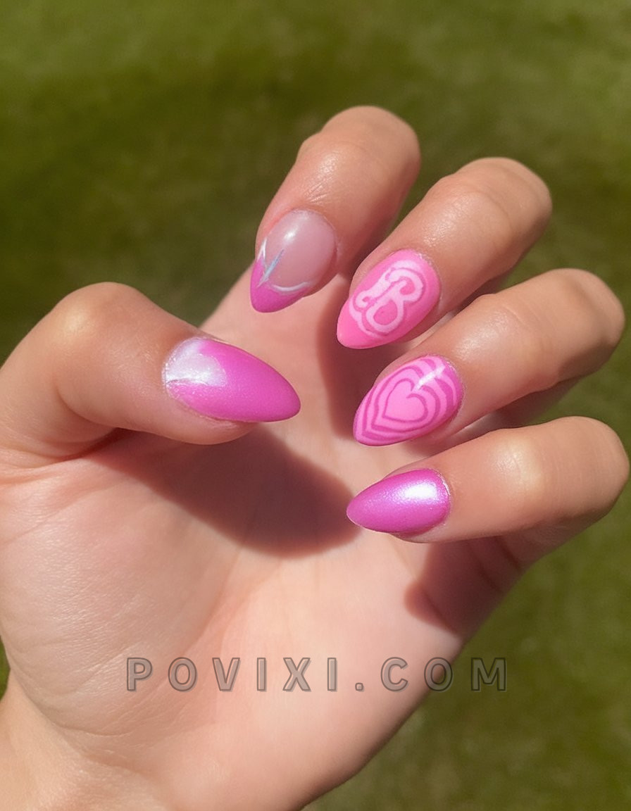 The nail design is a complete embodiment of the popular Barbiecore fashion trend of 2025. This aluminum-shaped set utilizes a matte finish to perfection, featuring the retro monogram B next to layered pop art hearts and a jelly pink shimmer that brings vintage memories to life. A variety of textures between the designs creates fun visual interest that remains consistent. The set of vintage nails is an ideal choice for all fans of retro fashion. Boys with bubblegum-colored bomber jackets also wear skater skirts while wearing white sneakers.