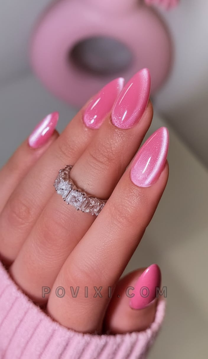 Success in elegance can be achieved by minimizing elements. The brush-painted shiny gel nails manage to transform a delicate feminine pale pink into something spectacular. The oval shape and sparkling iridescent finish create an elegant, satin sheen. A timeless design, its status is enhanced by an exquisite finish that combines the charm of vintage Hollywood with contemporary Gen Z aesthetics. Ruffles and blush linen pantsuits pair beautifully with the dazzling, high-gloss iridescent nails. This is your best seasonal choice for elegant yet powerful nail designs.