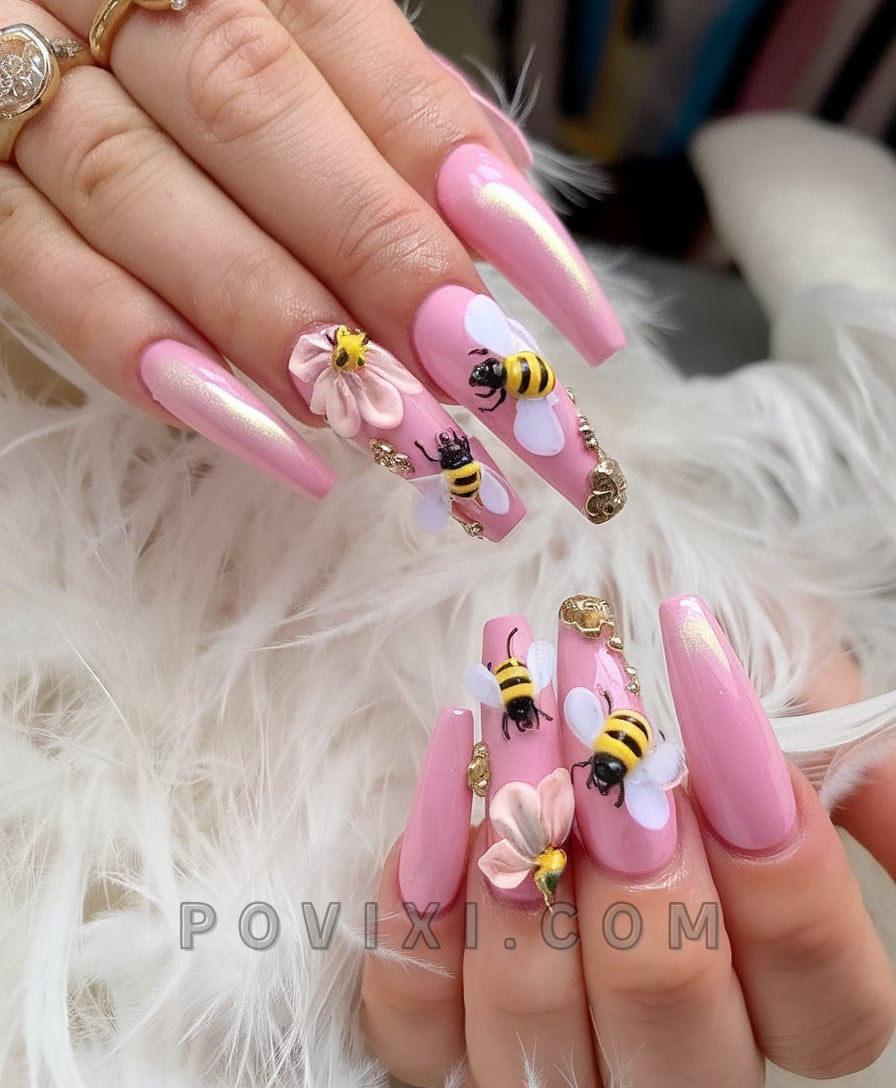 This acrylic nail masterpiece has the essence of artful sculptures rather than standard nail polish that will amaze those who love it. The set includes dimensional bumblebees with transparent wings along with delicate pastel flowers and gold foil highlights that blend artwork from fantasy with haute couture design. The set features long coffin-shaped nails with a soft pink base, while each embellishment exudes summer vitality. A floral bohemian look that is perfect for fashion outings and social media content creation, as well as expressing your flower-loving spirit through fashion outfits that include bohemian dresses along with straw hats and gold accessories. This selection meets the needs of people looking for eye-catching, glamorous designs and natural elements combined with advanced nail trends for 2025.