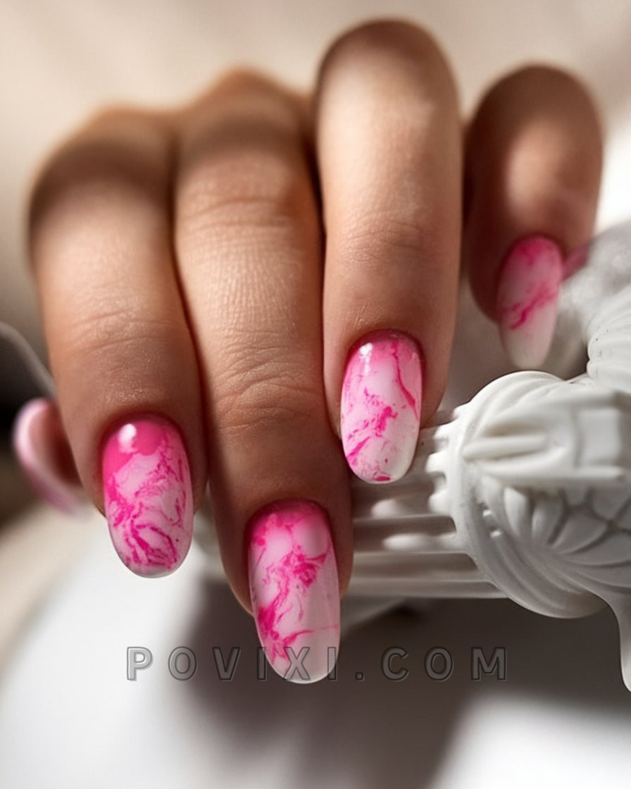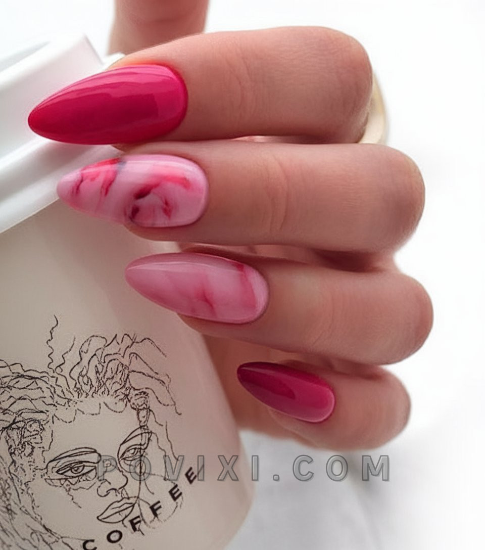 The 2025-ready gel look combines artistic elements with bold colors to create vibrant fuchsia and pink marble patterns. Fashion-conscious individuals will appreciate this design as it extends fingers through stiletto nail shapes, yet creates a stone-like marbled appearance that blends natural elements with contemporary fashion trends. This pair will stand out against monochromatic groups and neutral combinations.