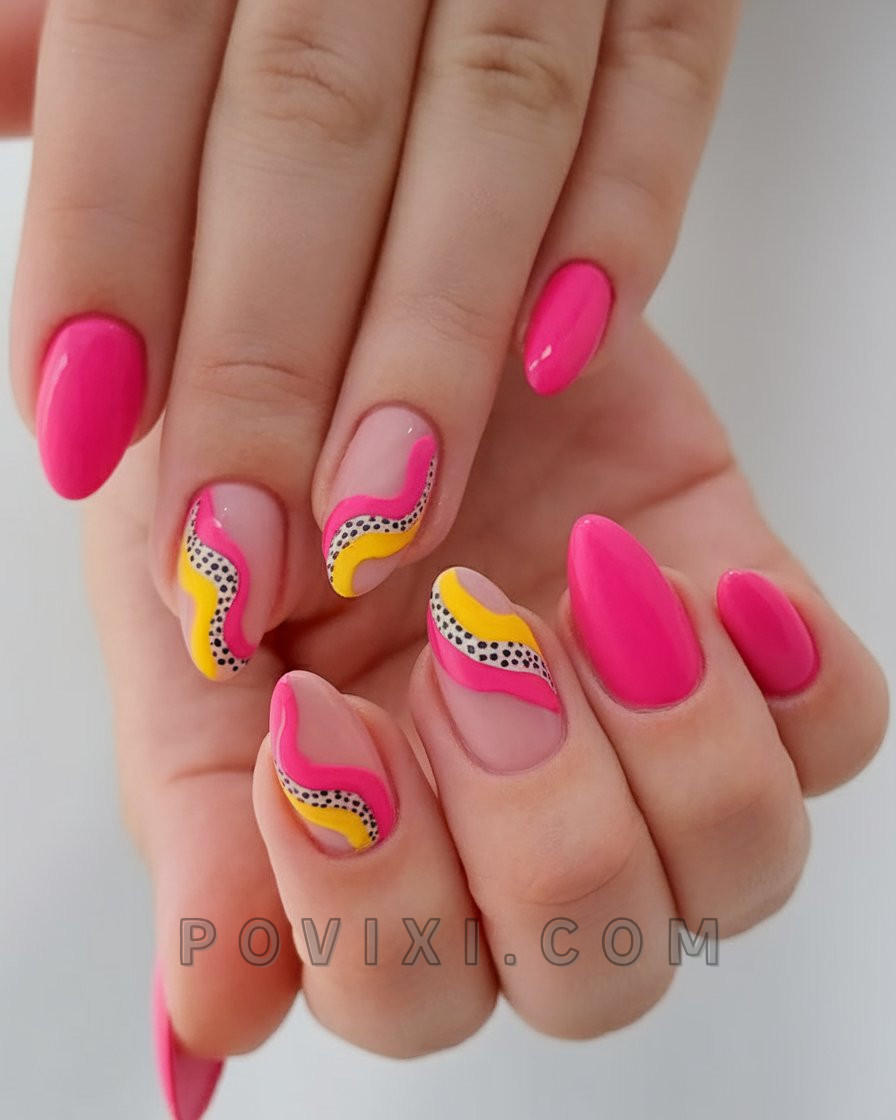 The almond-shaped nails feature bright shades of hot pink and yellow with black dots drawn on a transparent protective layer inspired by modern art and retro graphics. The energetic manicure conveys confidence and embodies personality traits through its groovy aesthetic. The nail design consists of colorful blocked wave patterns that give excellent results on all nail types when you want to express youthful energy.