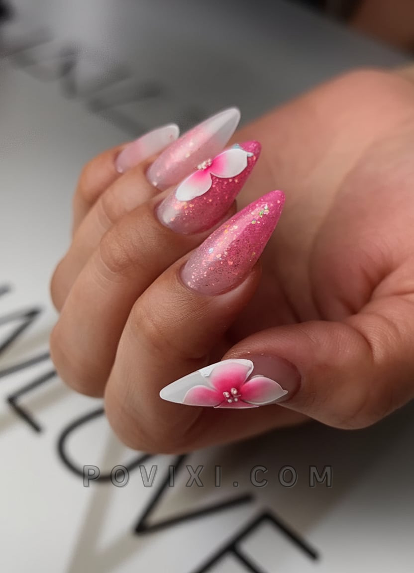 Summer design features soft shades of pink that fade to shimmering sparkles alongside 3D floral elements that add intricate detail to the nails. Handmade three-dimensional flowers appear as blooming petals that adorn two nails in white and deep pink with center details of pearlescent faux petals. This nail design offers a fresh, feminine look that is perfect for garden parties or seaside brunches. Works beautifully with flowing maxi dresses and delicate gold jewelry.