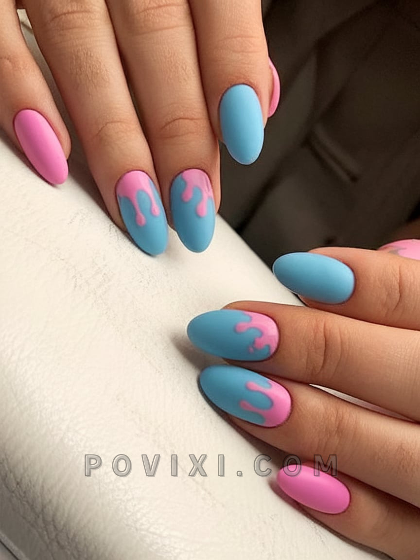 A dynamic, almond-shaped gel nail creation adds exciting drama with a vibrant style that sits on the fingertip area. The colorful combination of blue and pink and the dripping artwork create a fashion-forward statement that is perfect for the year 2025. A matte finish provides a modern appeal that makes these bright and cute nails an excellent choice for beach events or casual summer dining. Wear with a soft pastel ensemble or sneakers for the perfect relaxed, fun look.