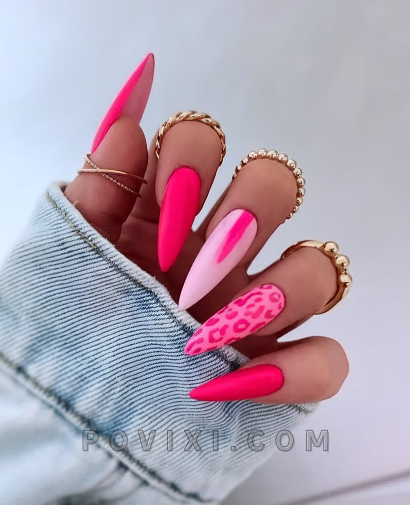 The coffin nail design delivers both power and femininity when you want real attitude and boldness. Neon and soft pink colors combined with a leopard accent create a summertime look that steals all the attention. The ultra-shiny top coat adds to the bling factor. Pair gold accessories with denim for this bold look for rooftop cocktails or a night on the town.